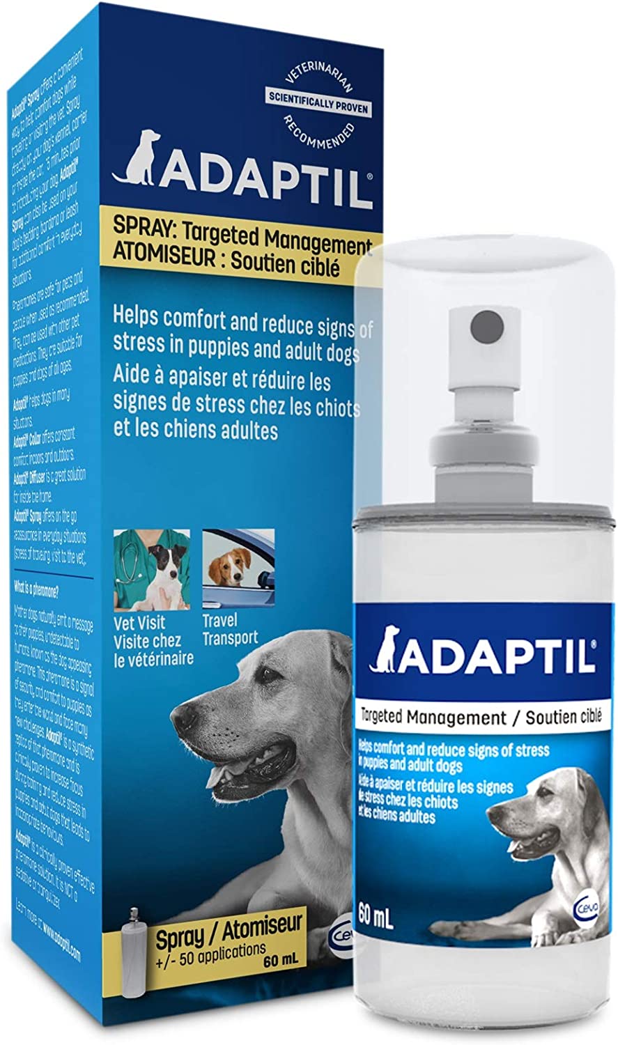 - Rociador de feromonas para ropa de cama de perro, juguetes, collares, interiores de perreras, superficies interiores de coches, etc.