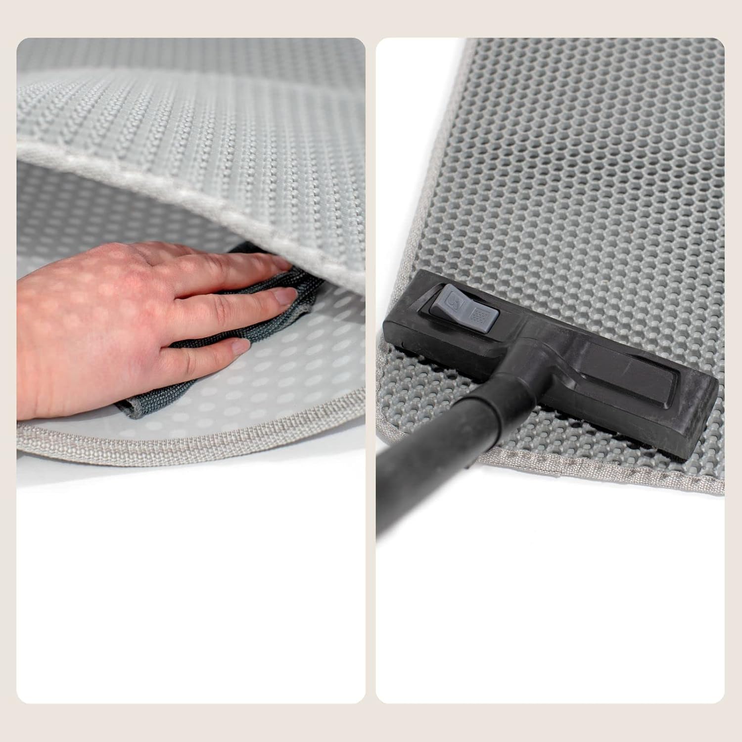 La limpieza es sencilla y rápida: puedes vaciar la arena acumulada con una simple sacudida o lavar la alfombrilla con agua para una limpieza más profunda. También es posible aspirar su interior si lo prefieres. Su facilidad de manejo permite colocarla debajo de la caja de arena o de los bebederos, asegurando que la arena quede atrapada al salir tu gato.