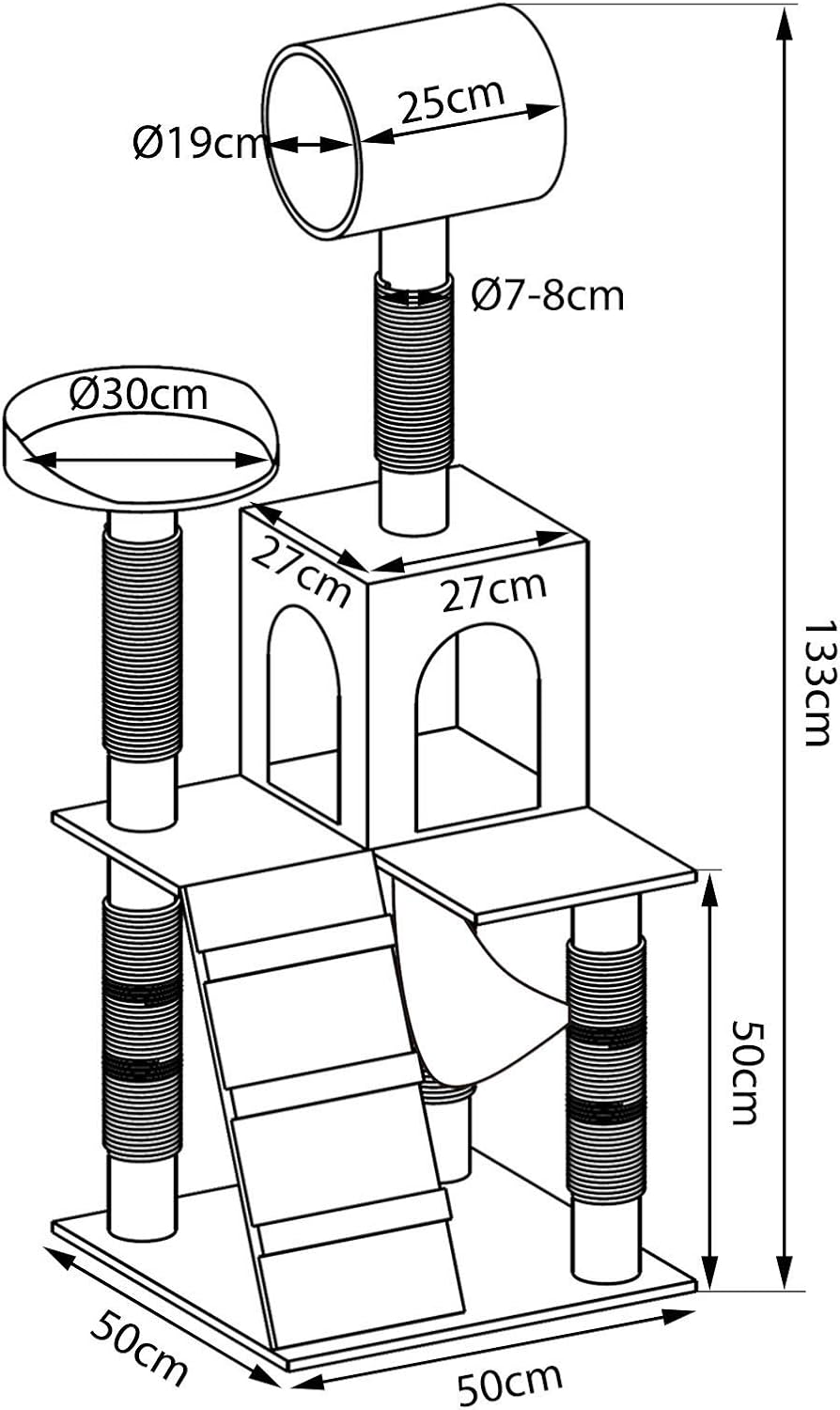 El árbol rascador lionto 133 cm es perfecto para el entretenimiento y descanso de tu gato, con una base de 50 x 50 cm y una altura de 133 cm. Incluye barras de sisal de 8 cm de diámetro, una caseta, una plataforma y materiales extrasuaves que garantizan comodidad. Su diseño compacto, de 60 x 60 x 133 cm con complementos, asegura estabilidad y durabilidad gracias al sisal resistente. Ideal para mantener a tu mascota activa y feliz.