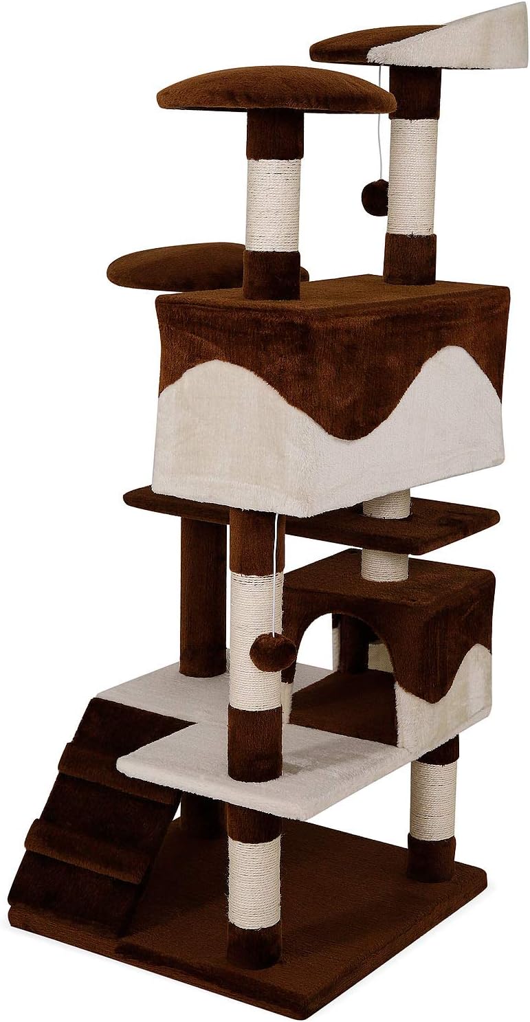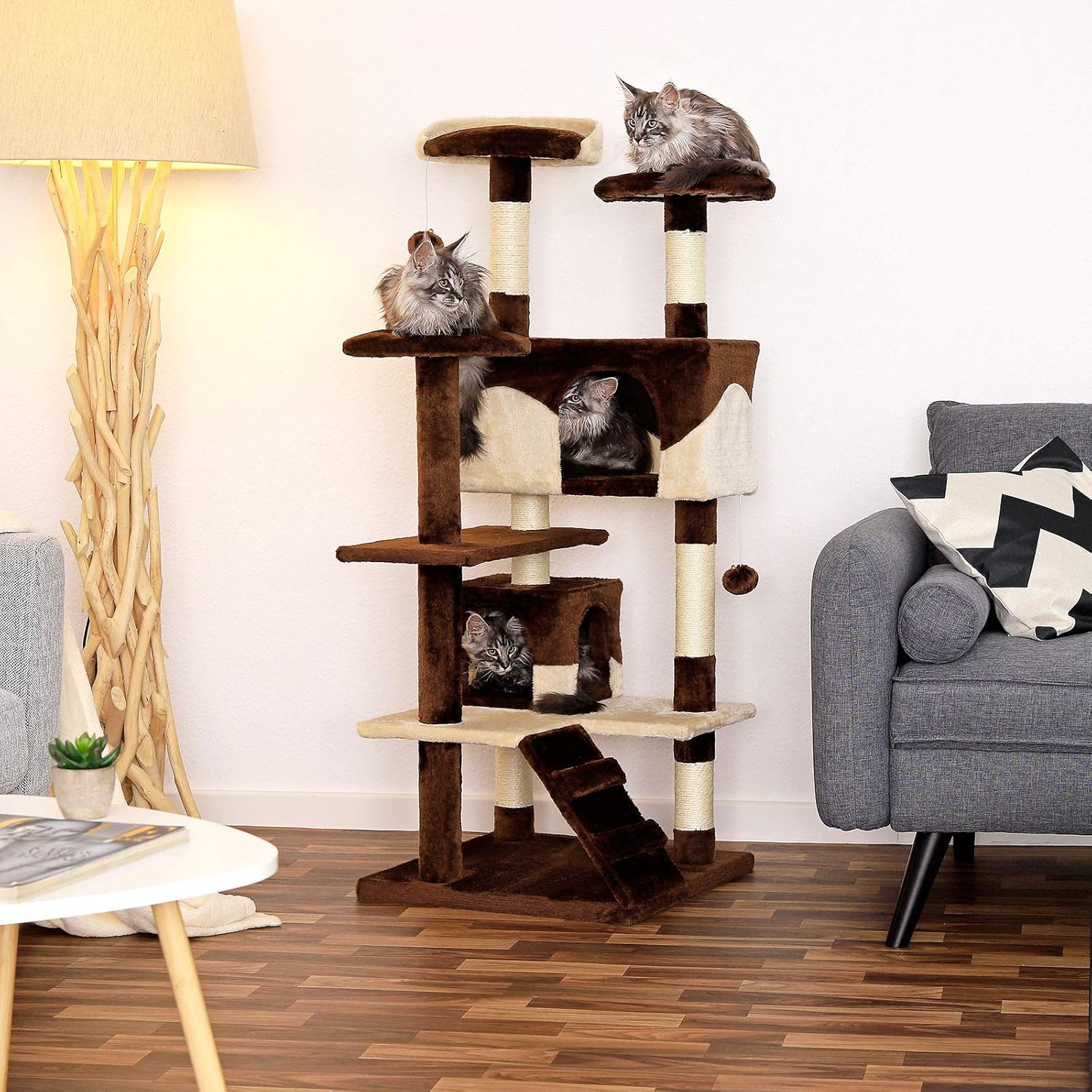 árbol rascador lionto para gatos: Descubre el árbol rascador lionto para gatos, un accesorio imprescindible para el bienestar de tus felinos. Este modelo, en elegante combinación marrón-beige, no solo es funcional, sino que también se integra perfectamente en cualquier espacio de tu hogar. Con una base estable de 51 x 51 cm y una altura total de 130 cm, ofrece un diseño compacto pero versátil. Además, sus dimensiones con complementos alcanzan 62 x 62 x 130 cm, proporcionando un amplio espacio para que tus gatos jueguen, descansen y afilen sus uñas.