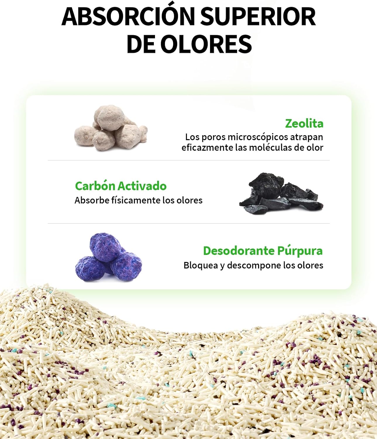 - Control de olores que realmente funciona: Gracias a su mezcla con zeolita y carbón activado, esta arena neutraliza eficazmente los olores desagradables como el amoníaco y el sulfuro de hidrógeno. Además, el desodorante púrpura descompone los olores persistentes, dejando una sensación de frescura que transforma la experiencia de limpieza.