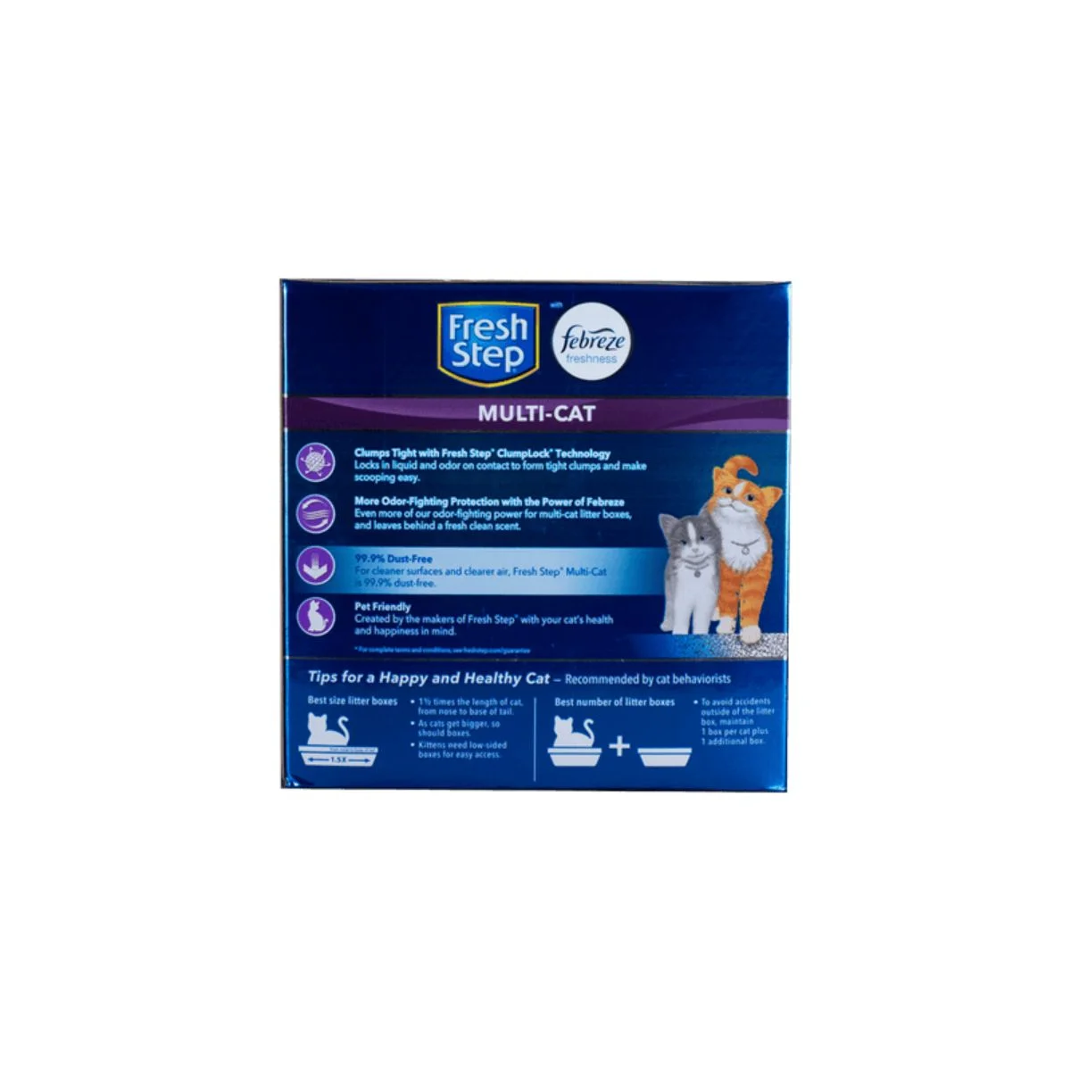 Fresh Step Multi Cat con Febreze es la arena sanitaria premium que garantiza una caja de arena limpia y libre de olores por hasta 10 días. Con una tecnología avanzada, formulaciones patentadas y el poder de Febreze, esta arena aglomerante elimina de manera óptima los olores más fuertes, desde la orina hasta las heces, dejando un aroma fresco y limpio en tu hogar.