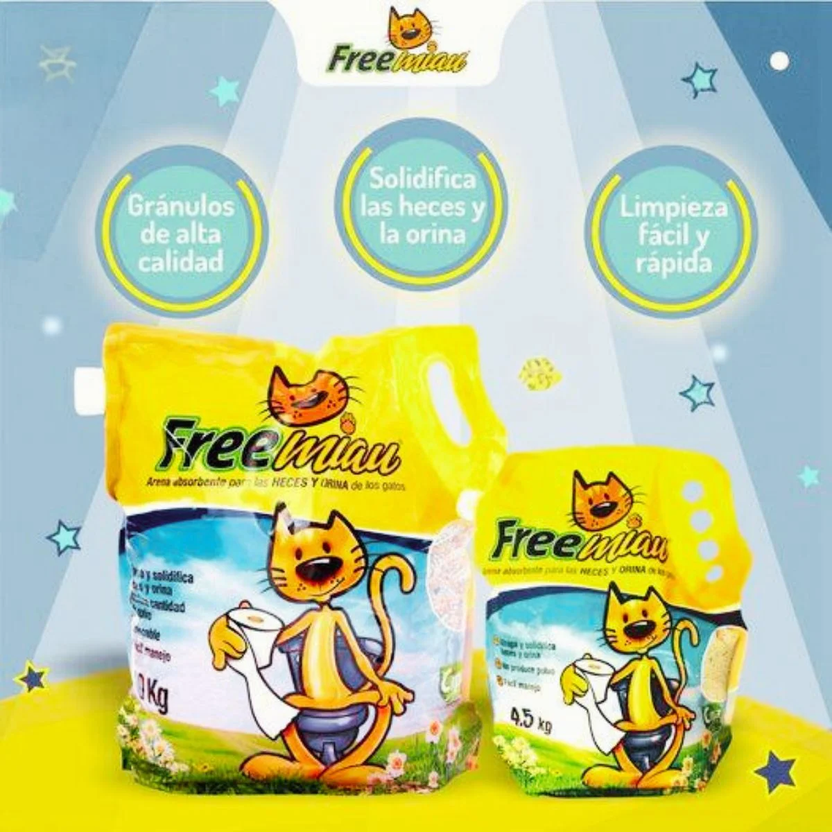 Arena para Gatos Freemiau, la elección perfecta para mantener la limpieza y frescura en la caja de arena de tu gato. Con una fórmula avanzada que neutraliza el amoniaco y controla los malos olores, Freemiau garantiza un ambiente libre de aromas molestos por mucho más tiempo.