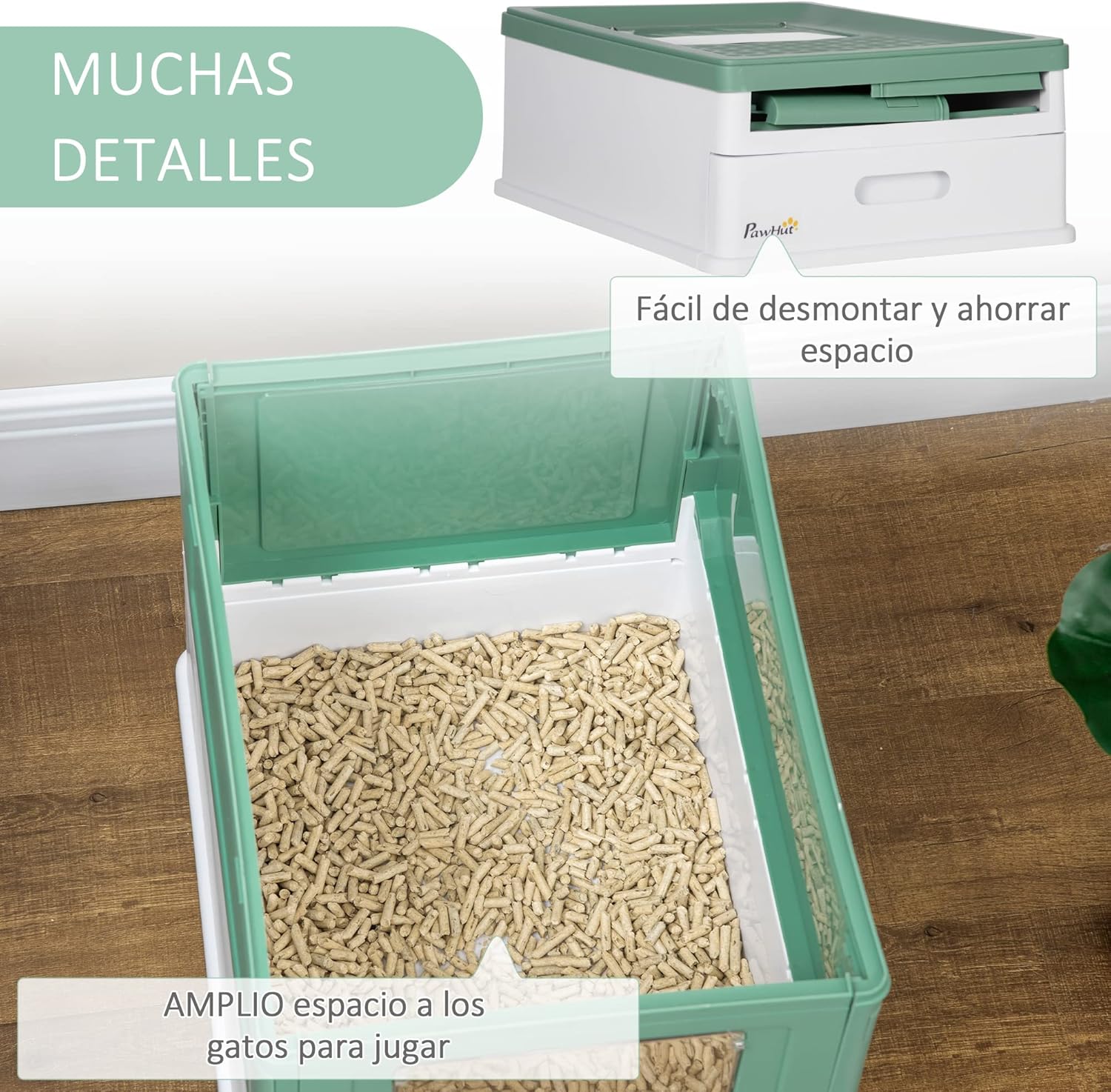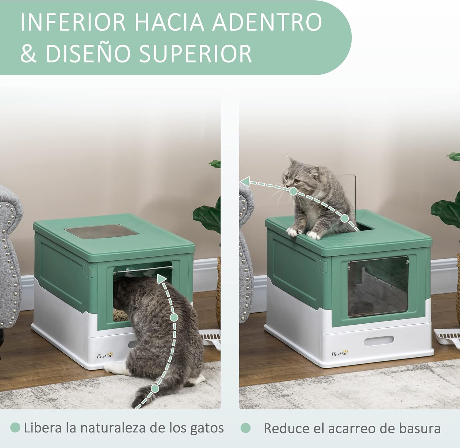 Con una puerta frontal que permite un fácil acceso y una puerta superior que solo se abre hacia afuera, este arenero cubierto PawHut para gatos está diseñado para evitar derrames de arena mientras facilita la salida del gato. Su amplio interior es ideal para gatos de hasta 5 kg, y su diseño plegable lo hace práctico para guardar cuando no está en uso.