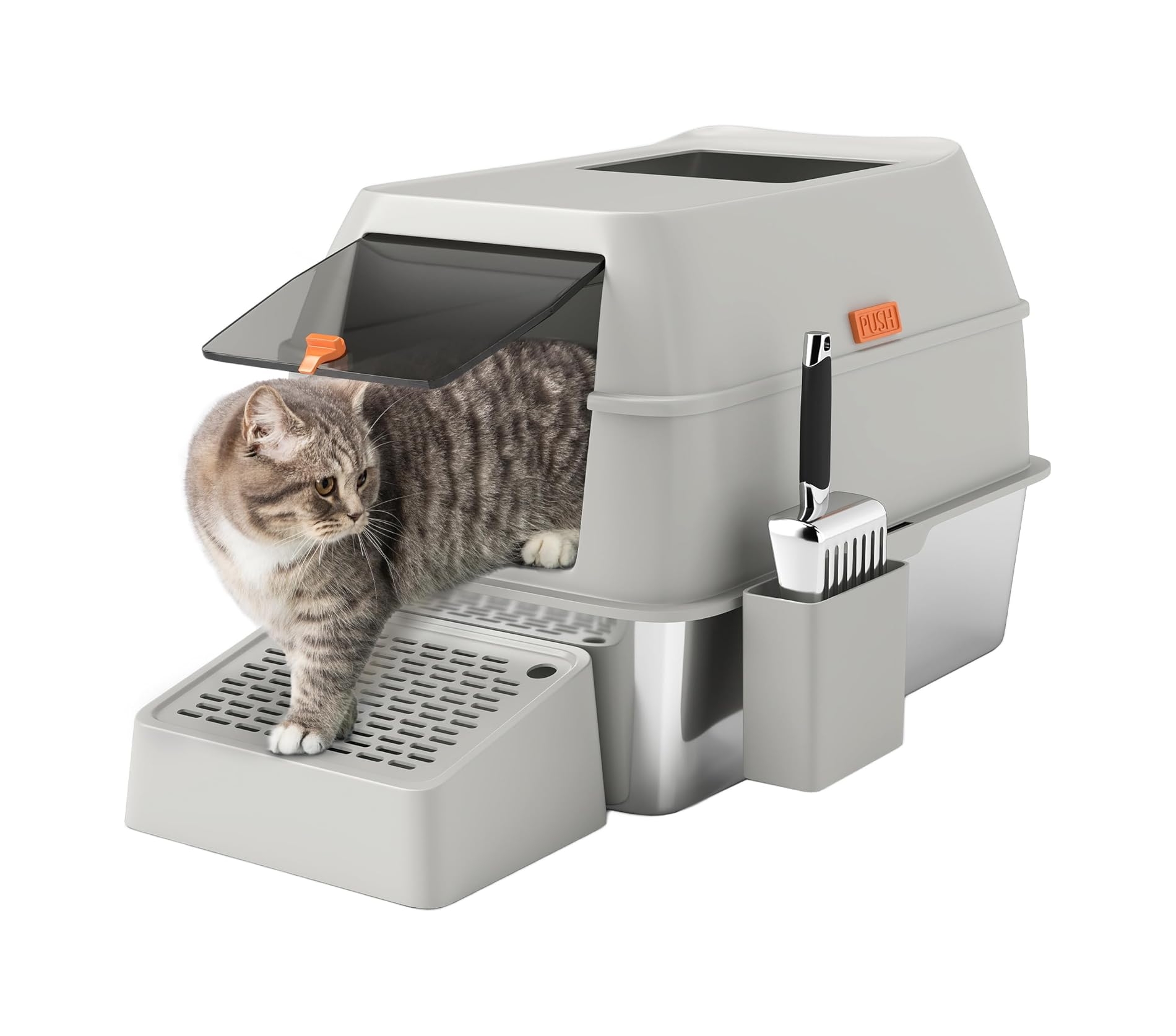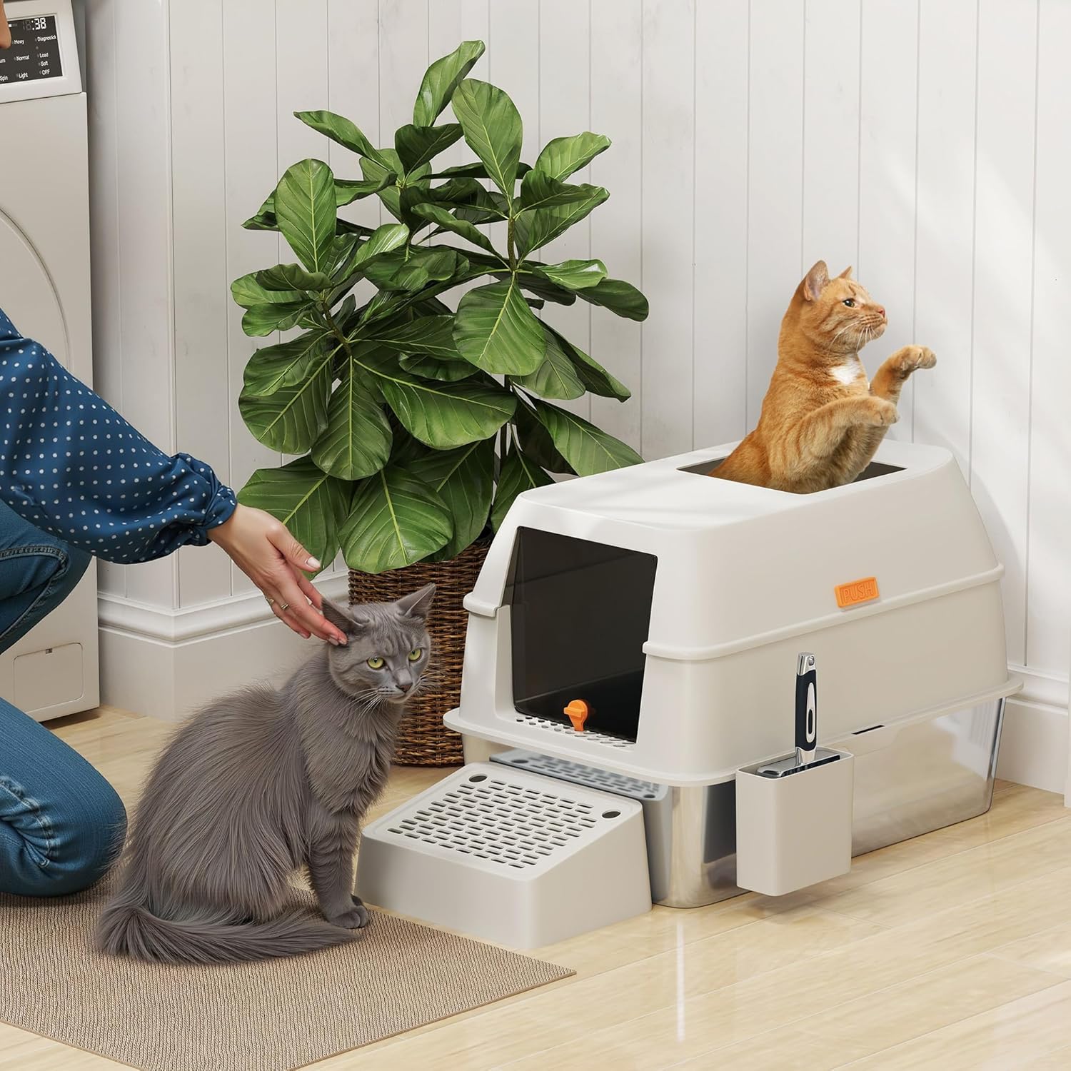 El arenero para gatos de acero inoxidable incluye una práctica pala anticorrosiva, ideal para facilitar la limpieza diaria, y una caja de almacenamiento para mantener todo en orden. Sus dimensiones totales, de 60,2×40,5×40,5 cm, lo hacen adecuado para gatos de hasta 4,5 kg y es muy fácil de montar, asegurando practicidad para ti y comodidad para tu mascota.