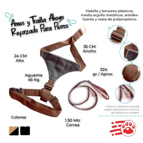 Arnés y Traílla Ahogo Reforzado Para Perros Mayoristas PetOutlet ideal para la comodidad a la hora del paseo y más seguridad evitando que el perro se suelte o escape. Es como y de materiales muy suaves. El arnés para perros no es la solución a todos los problemas, pero si es menos perjudicial y más ventajoso que el collar, ya que evita daños físicos importantes, hay consideraciones que debemos tener presentes a la hora de escoger el correcto para nuestro perro, para ello debemos elegir el que no cause daños físicos: su material debe ser suave, que no provoque heridas en las zonas de fricción como axilas y pecho, debe ser de material transpirable y la argolla de unión a la correa debe ser trasera para que la fuerza se reparta por todo el cuerpo y no centralice en los miembros anteriores.