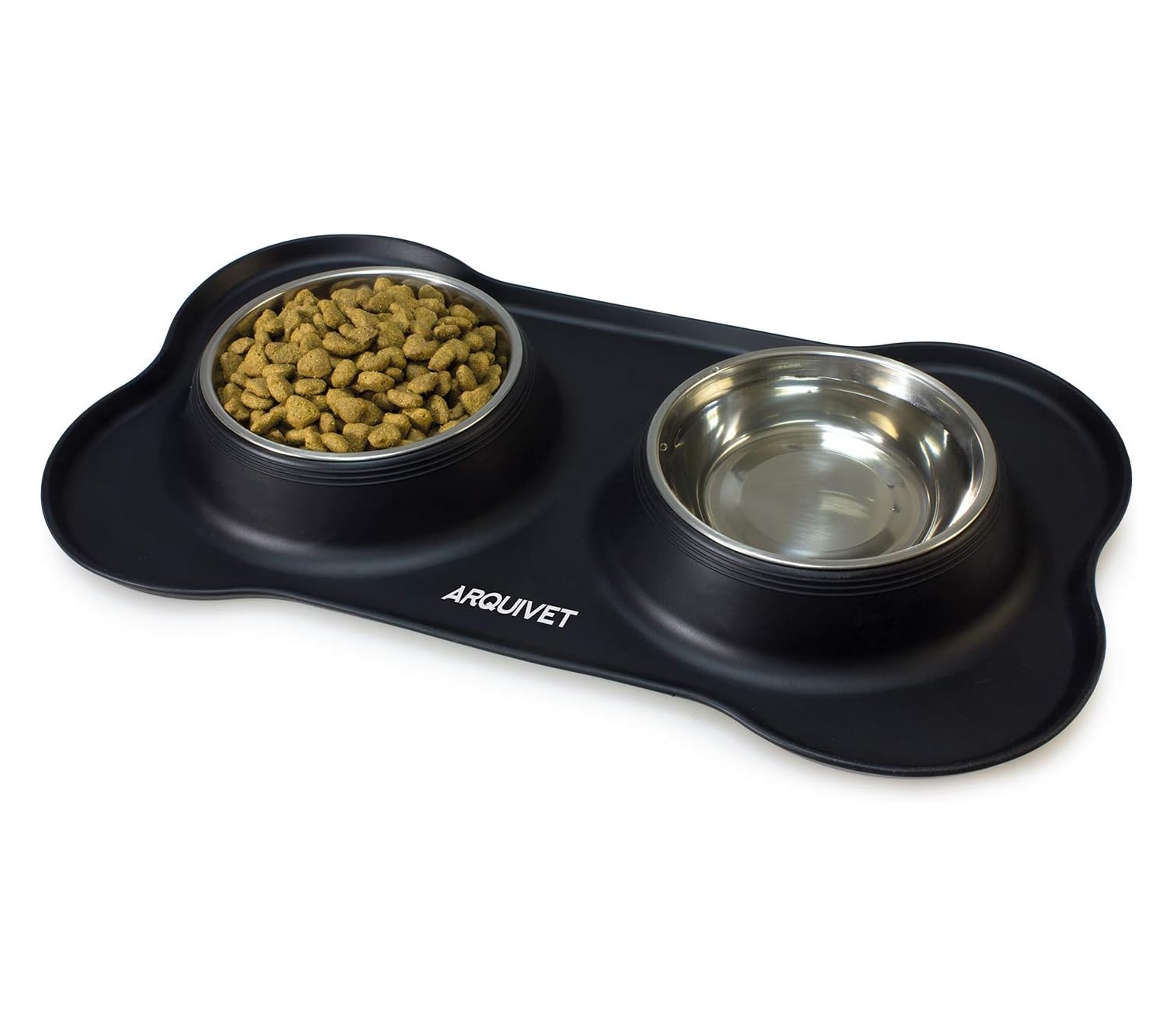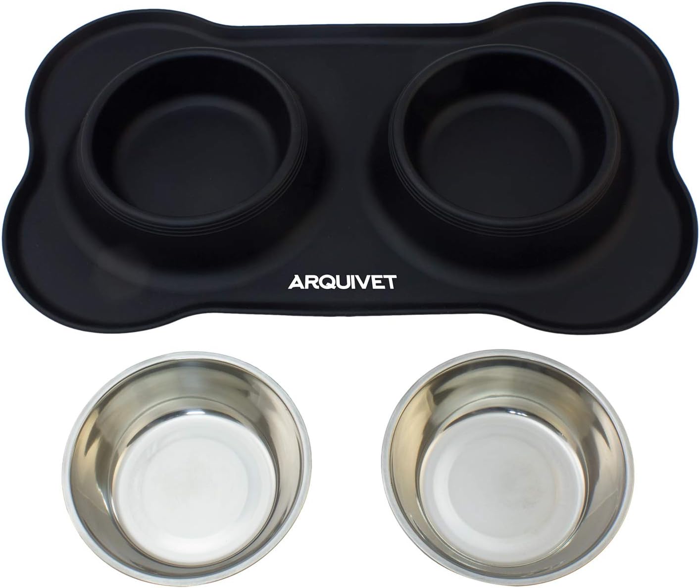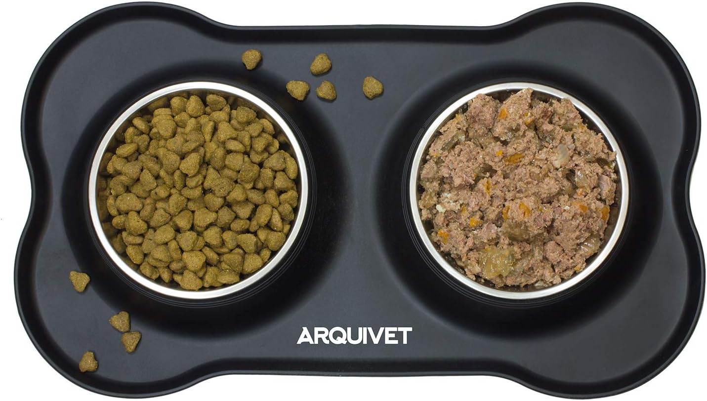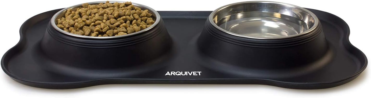 bebedero y comedero para gatos: Este práctico bebedero y comedero para gatos combina funcionalidad y diseño en un solo producto. Incluye un tapete de silicona en forma de hueso, de color negro, y dos cuencos de acero inoxidable, ideales tanto para comida como para agua. Perfecto para gatos y perros, su diseño evita derrames y mantiene la zona de alimentación limpia.