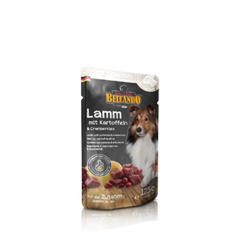 Carne, hígado, panza, pulmón y corazón de cordero (63 %); caldo de carne de cordero (28 %); patata (4 %); arándanos (4 %); aceite de cardo (0,5 %); minerales (0,5 %)