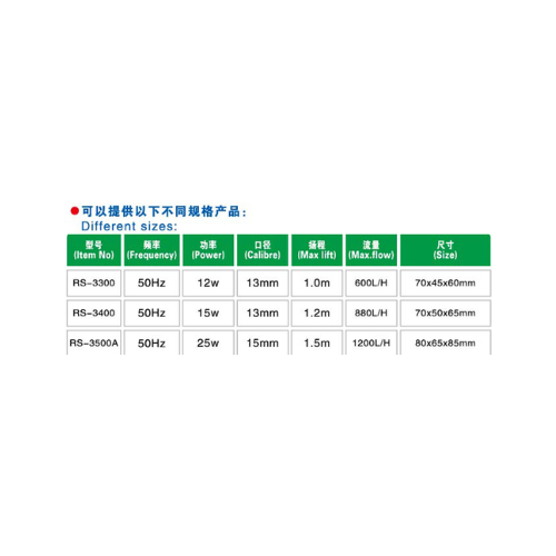 Flujo de 1200L/h. Altura máxima de 1,5m. Potencia de 25w.