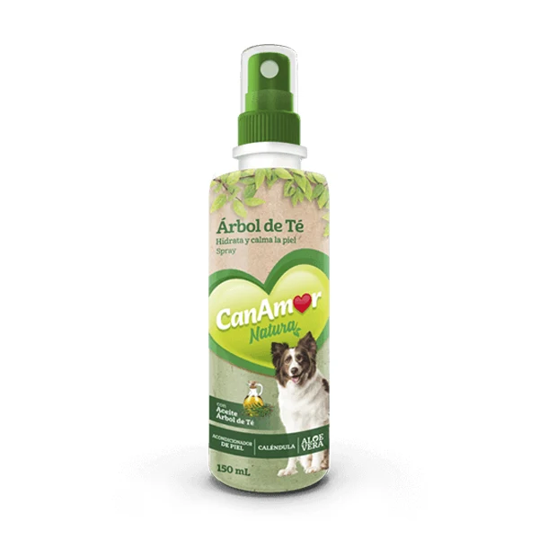 Alivia y protege la piel de tu perro con CanAmor Spray Árbol de Té, fórmula calmante y antiséptica con caléndula y árbol de té. Fácil de aplicar.