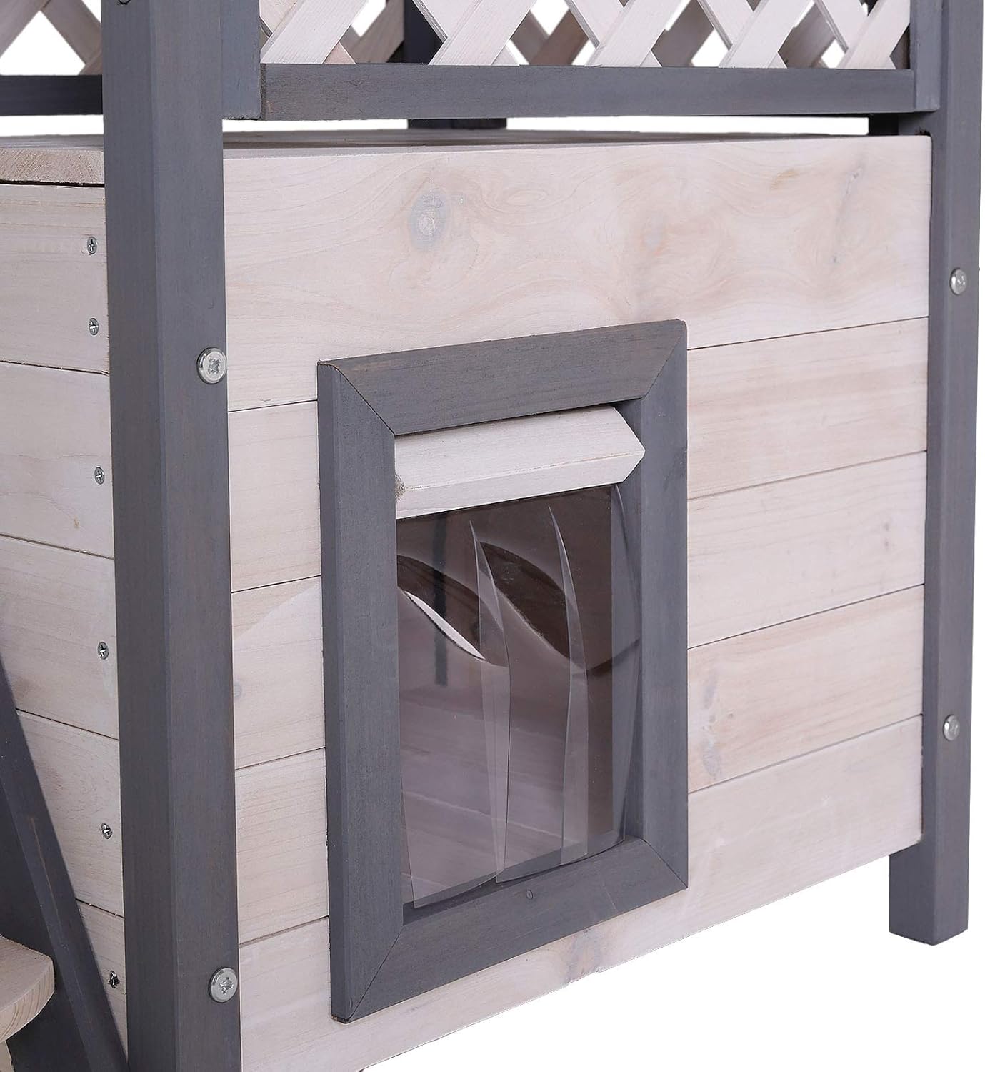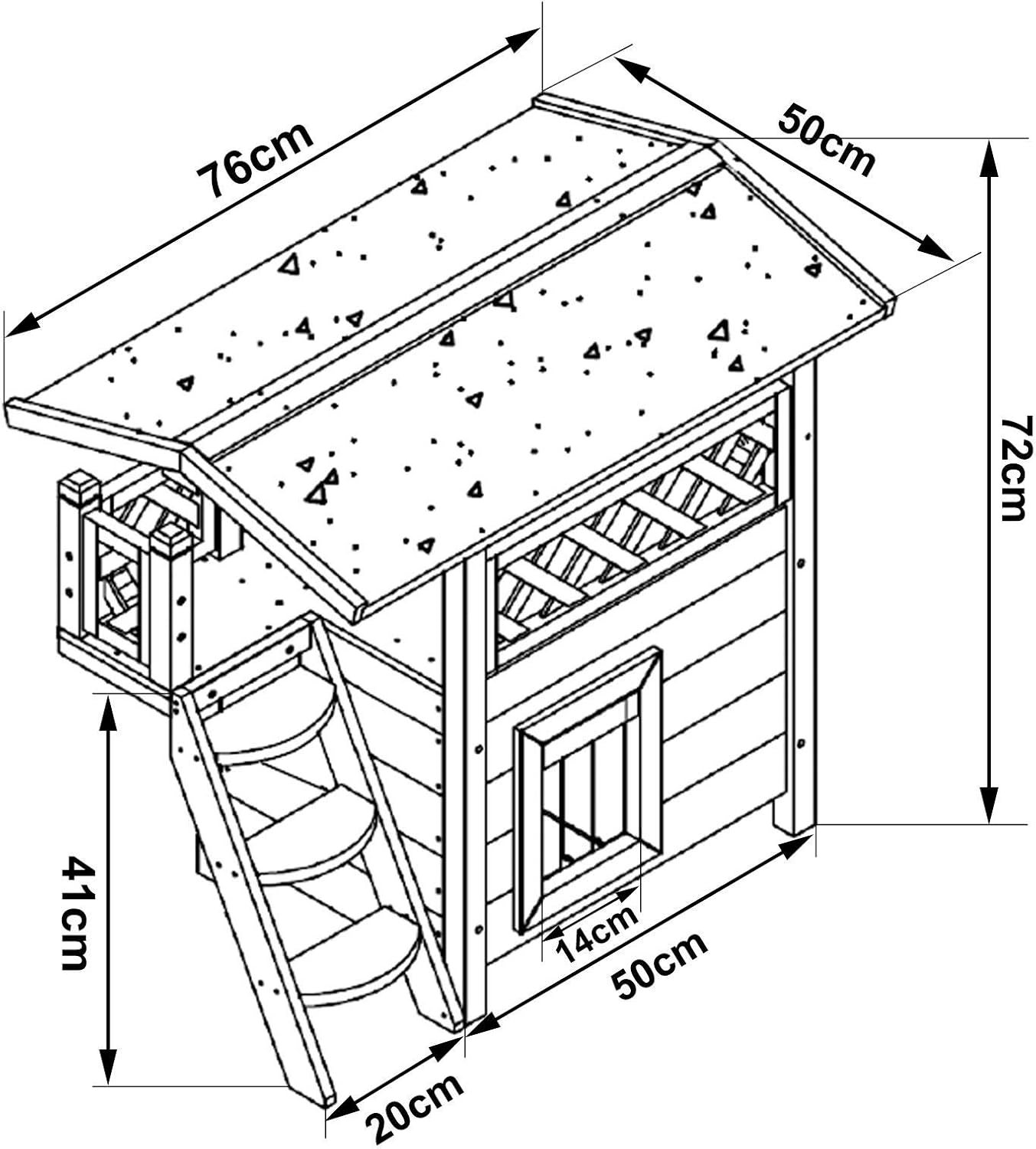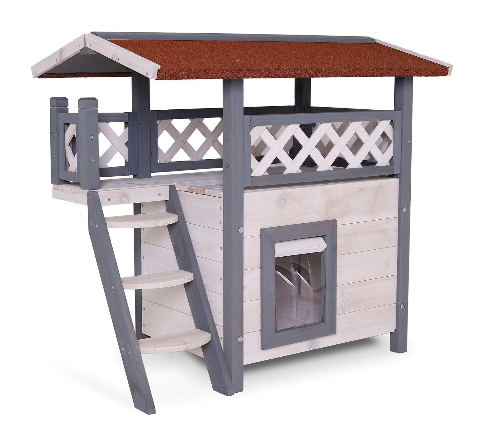 Fabricada con materiales resistentes, esta casa protege a tu gato del sol, la lluvia y el viento gracias a su techo cubierto con tapetes de asfalto. La puerta con listones de PVC asegura una entrada y salida fáciles, mientras que la madera pretratada con pintura protectora garantiza durabilidad frente a las inclemencias del tiempo. Su montaje es sencillo e incluye instrucciones detalladas para que puedas ensamblarla sin complicaciones. Lleva comodidad y seguridad a tu hogar con esta práctica casa de gatos de madera.