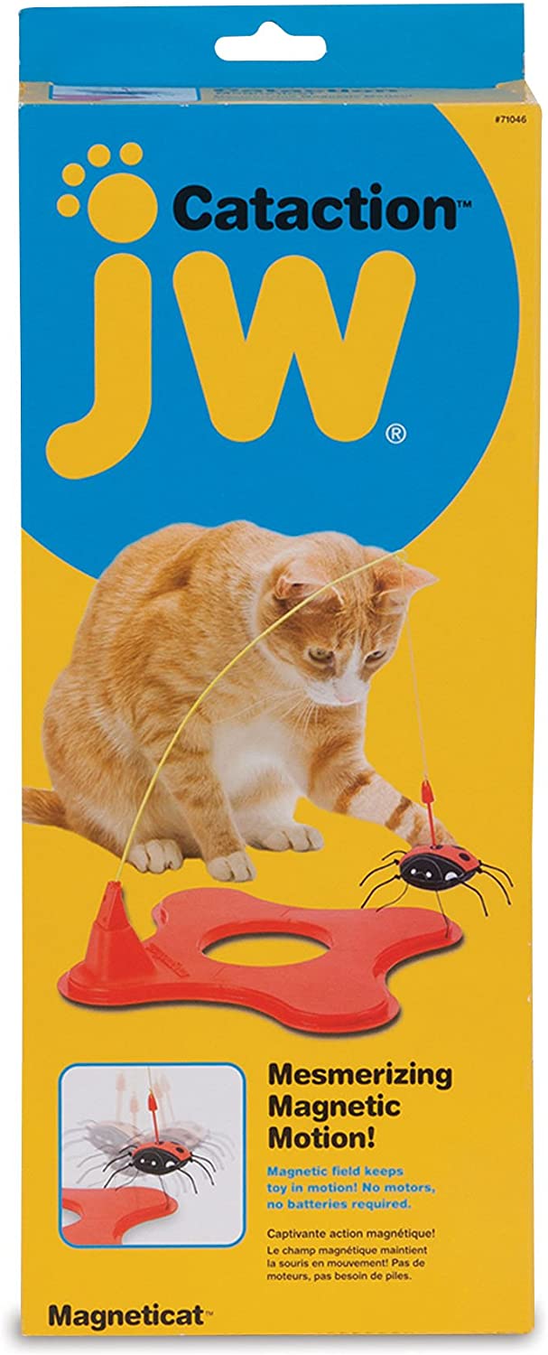 El juguete Magnetica de JW cautivara a tu mascota con sus hipnóticos movimientos, el juguete cuelga en medio de una base magnética, las fuerzas opuestas mantienen a la mariquita en movimiento este juguete puede mantener a tu gato ocupado durante bastantes horas mientras estas ausente.
