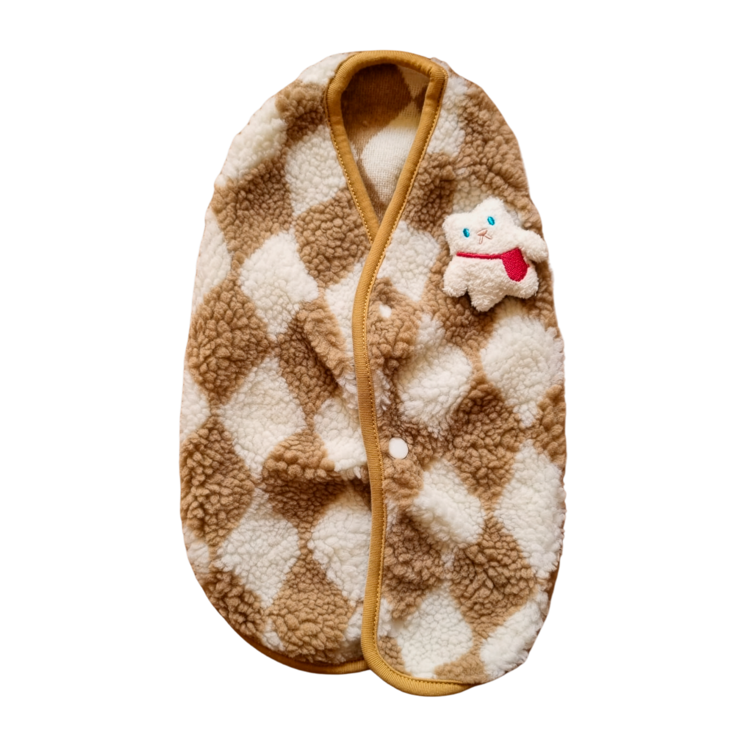 - Abrigo o chaleco de invierno con tejido de textura suave tipo «carnero» o borrego, ideal para mantener abrigados a gatos y perros de raza pequeña.Características: