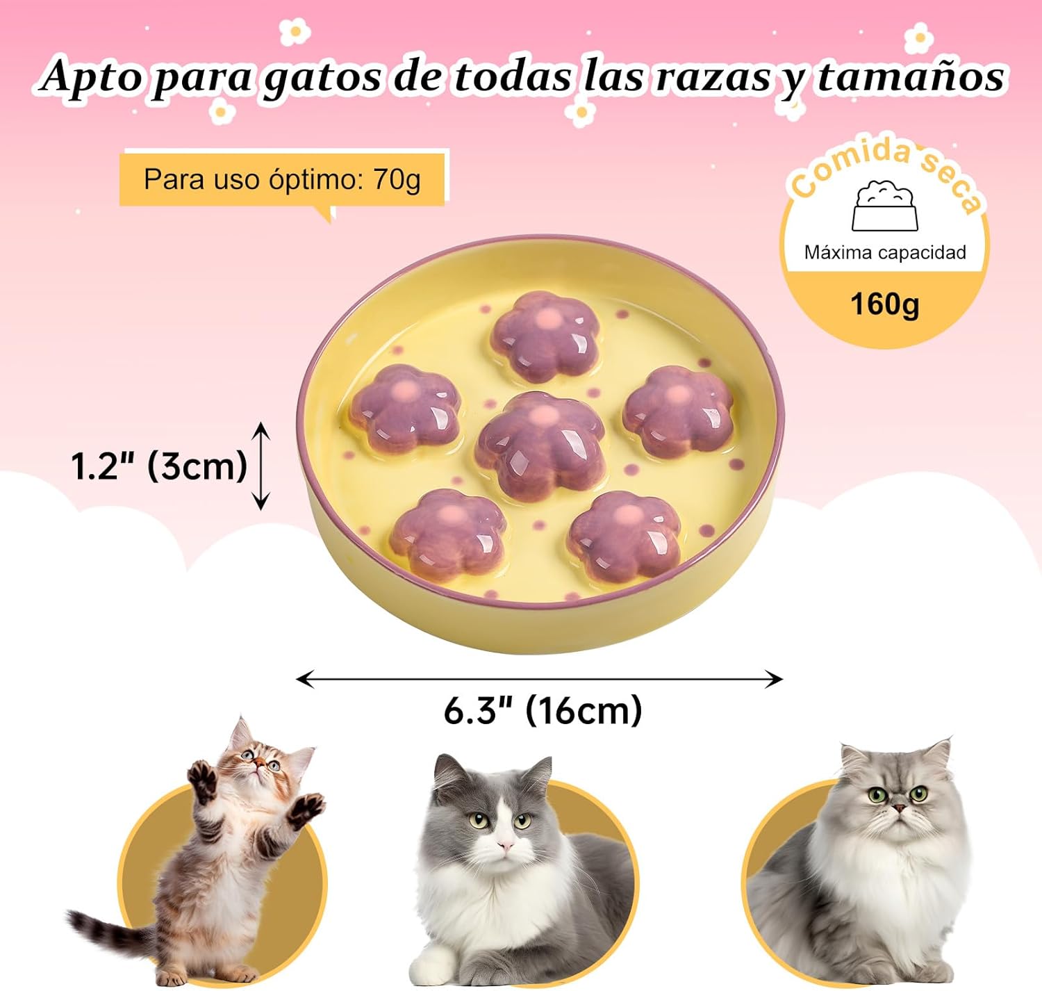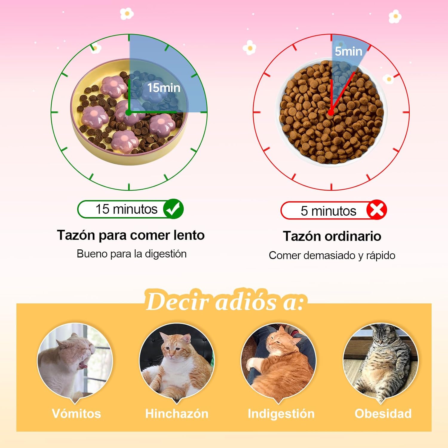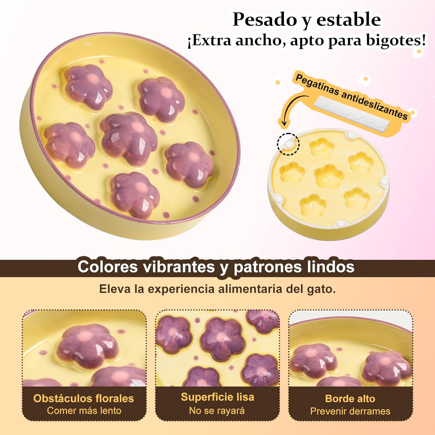 comedero antivoracidad para gatos cerámica: Descubre el comedero antivoracidad para gatos cerámica, diseñado para mejorar la salud y el bienestar de tu felino. Con obstáculos elevados en forma de flor, este innovador comedero ralentiza la velocidad al comer, ayudando a reducir problemas como el atragantamiento, la hinchazón y los vómitos. Además, fomenta hábitos de alimentación más saludables, perfectos para prevenir el sobrepeso en gatos.