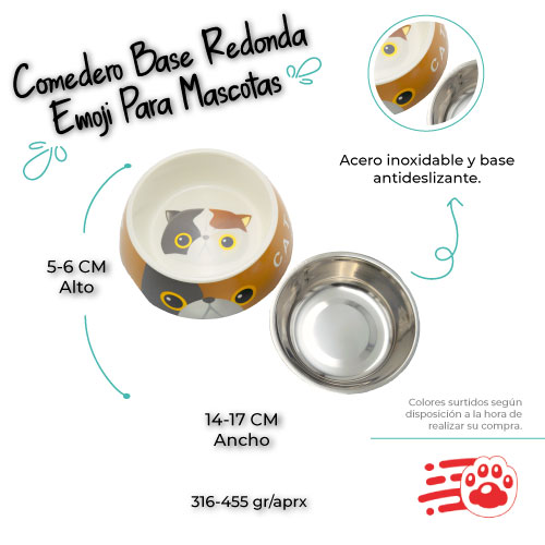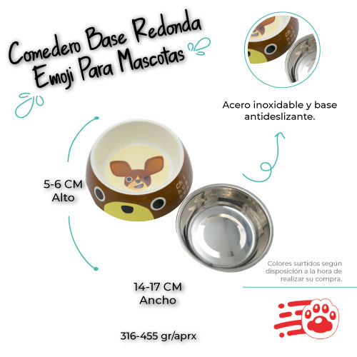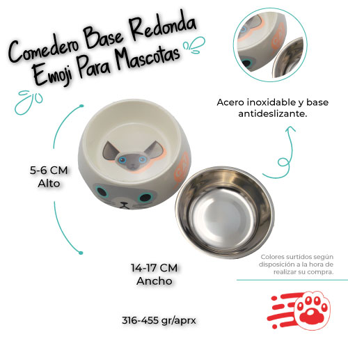 Comedero Base Redonda Emoji Para Mascotas Mayoristas PetOutlet, redondo de acero inoxidable que contiene un plato adicional de acero para mejor su utilidad, ideal para el alimento o bebida de las mascotas. Recordar que la alimentación de las mascotas es muy importante para los peludos ya que una buena alimentación influye mucho en su salud y crecimiento sano. Viene en diseño emoji de perro razas o de gatos. Perfecto para el gusto de cada mascota. Adicional su base es antideslizante ideal para que el comedero no se mueva y evite regar o votar el alimento.