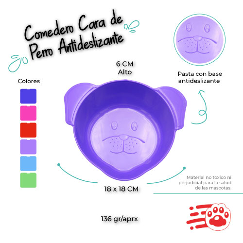 Comedero cara de perro antideslizante mayoristas PetOutlet, con base antideslizante ideal para que no se mueva y evite regarse el alimento de las mascotas. Lo mejor es elegir un recipiente con bordes redondeados para que sea fácil de limpiar y que no tenga ranuras donde pueda quedar grasa o residuos de alimentos.