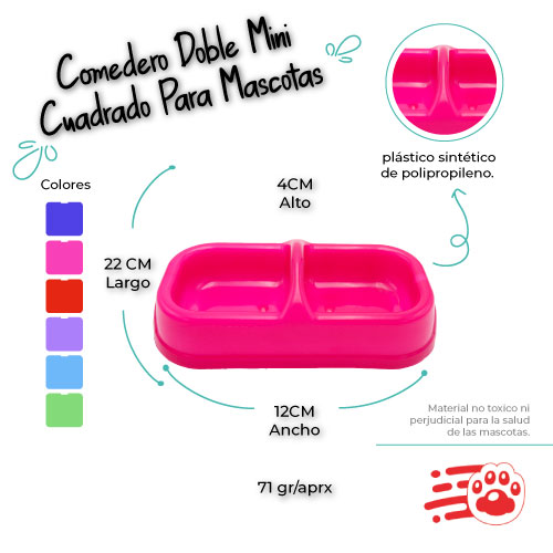 Comedero Doble Mini Cuadrado Mayoristas PetOutlet ideal para colocar distintos tipos de comidas en el comedero o colocar alimento y líquido. Lo mejor es elegir un recipiente con bordes redondeados para que sea fácil de limpiar y que no tenga ranuras donde pueda quedar grasa o residuos de alimentos.