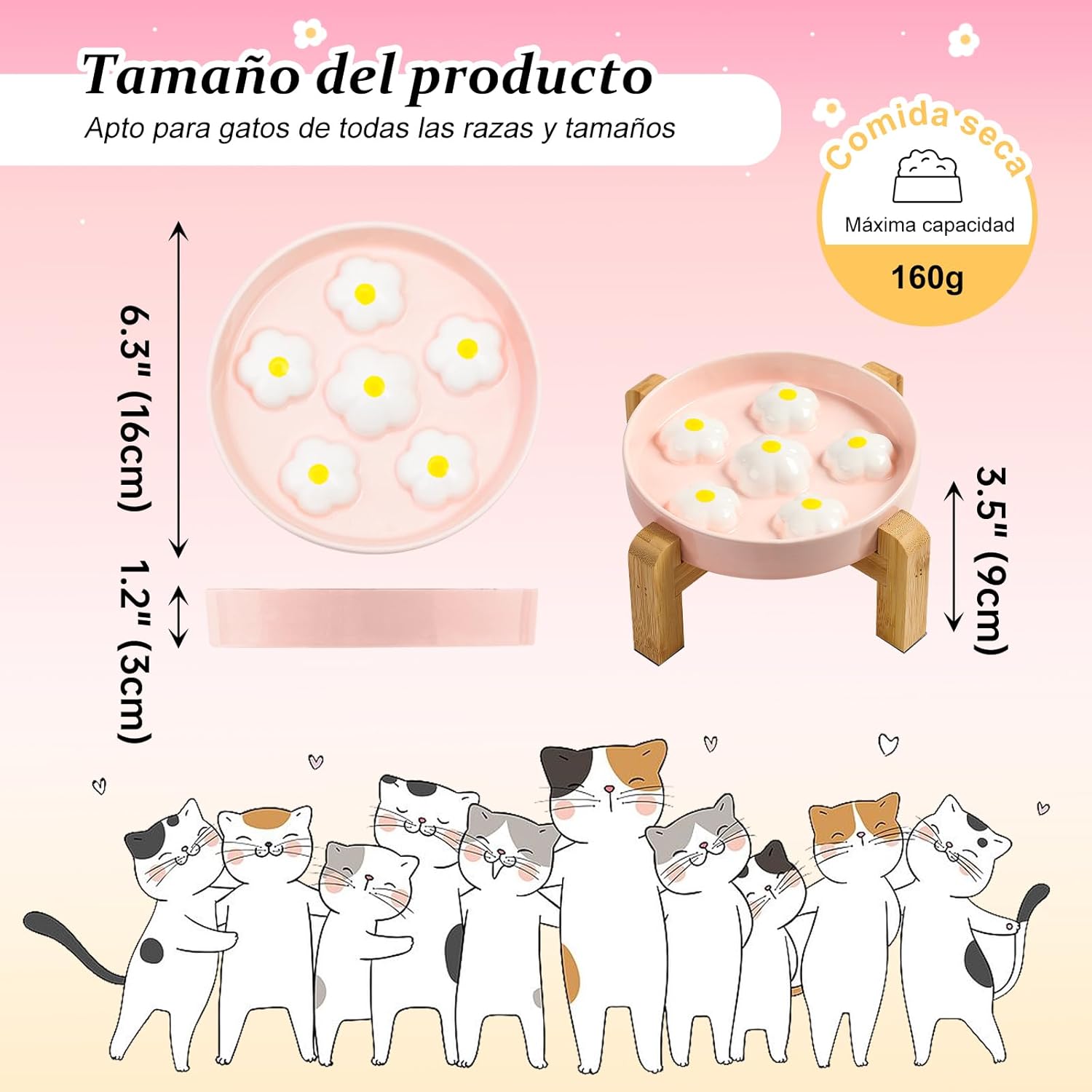 Este elegante comedero combina funcionalidad y estética con un diseño inspirado en la naturaleza. Sus adorables flores de colores no solo alegran el rincón de alimentación, sino que también cuentan con una superficie suave y un diámetro amplio que elimina el estrés en los bigotes de su gato. Fabricado con cerámica de calidad alimentaria libre de tóxicos y un soporte de bambú natural, este producto es seguro, ecológico y duradero. Incluye pegatinas antideslizantes para mayor estabilidad, evitando resbalones o vuelcos.