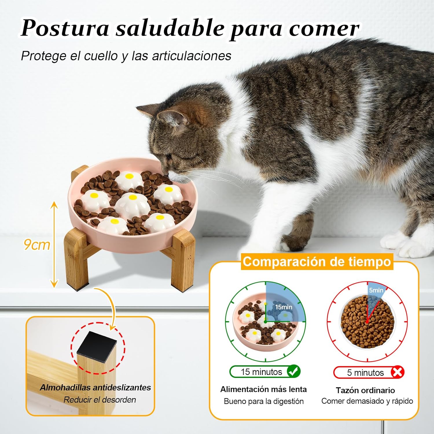 Perfecto para cualquier tipo de alimento, ya sea seco, húmedo, enlatado o snacks, este comedero gato antivoracidad elevado es fácil de limpiar, siendo apto para lavavajillas y microondas. El soporte de bambú se mantiene impecable con solo pasarle un paño seco. ¡El accesorio ideal para cuidar la salud y el bienestar de su felino!