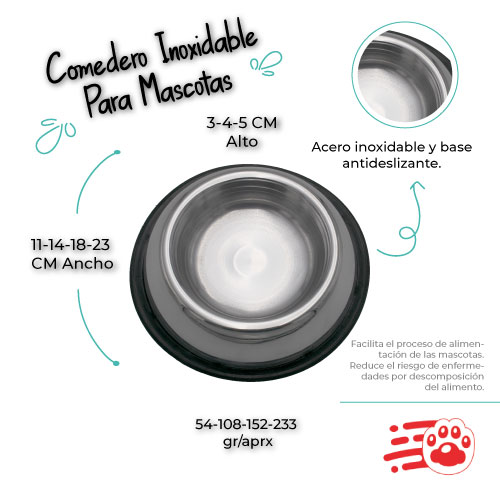 Comedero inoxidable antideslizante, de excelente calidad. Facilita el proceso de alimentación de las mascotas. Con acero inoxidable y caucho antideslizante que evita q el alimento o bebida se riegue o el comedero se mueva.