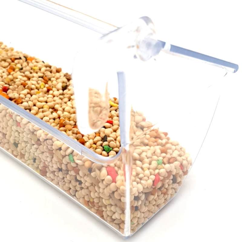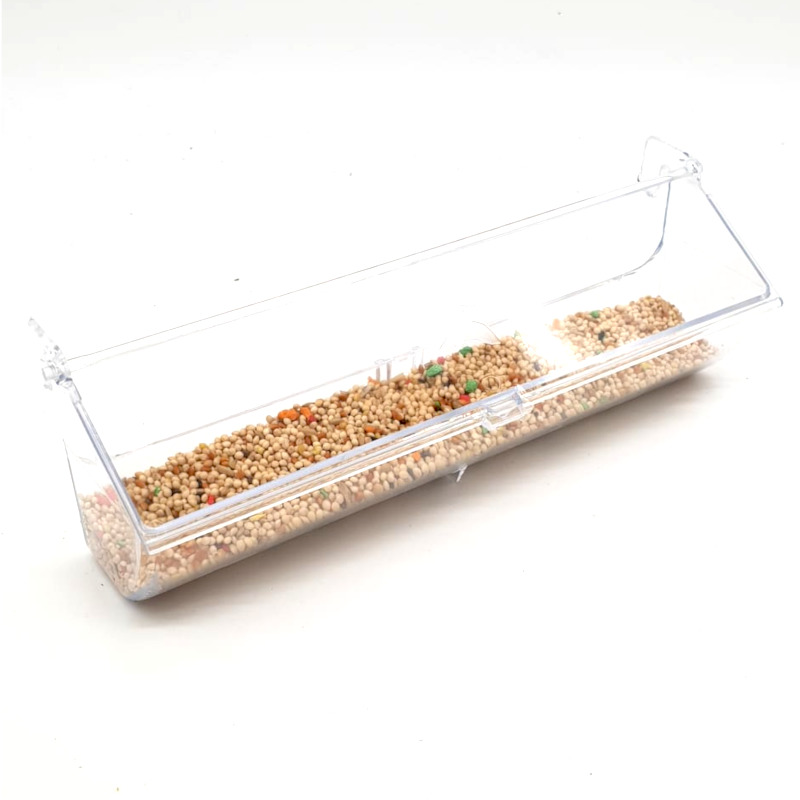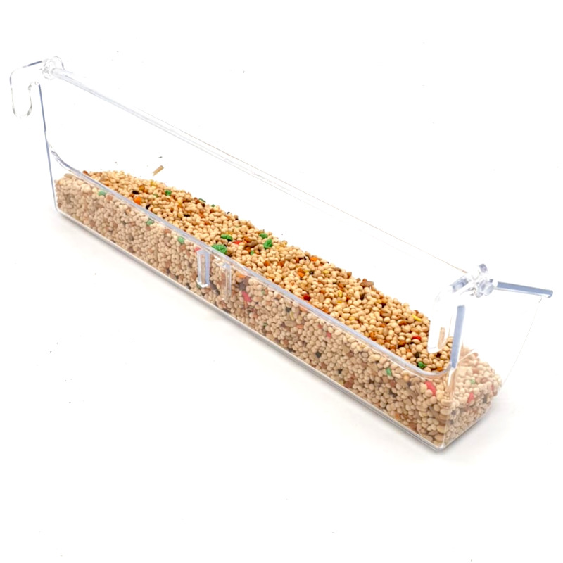 Comedero de plástico resistente con ganchos para sujetarlo a la jaula. Este funcional comedero permite alimentar a una gran cantidad de aves, tanto dentro de una pajarera como en un sitio reparado al aire libre.Tiene la suficiente capacidad para evitar problemas por falta de espacio.