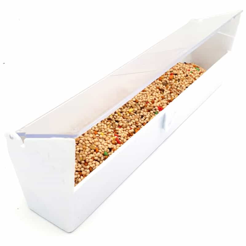 Comedero de plástico opaco resistente. Este funcional comedero permite alimentar a una gran cantidad de aves, tanto dentro de una pajarera como en un sitio reparado al aire libre. Tiene la suficiente capacidad para evitar problemas por falta de espacio.