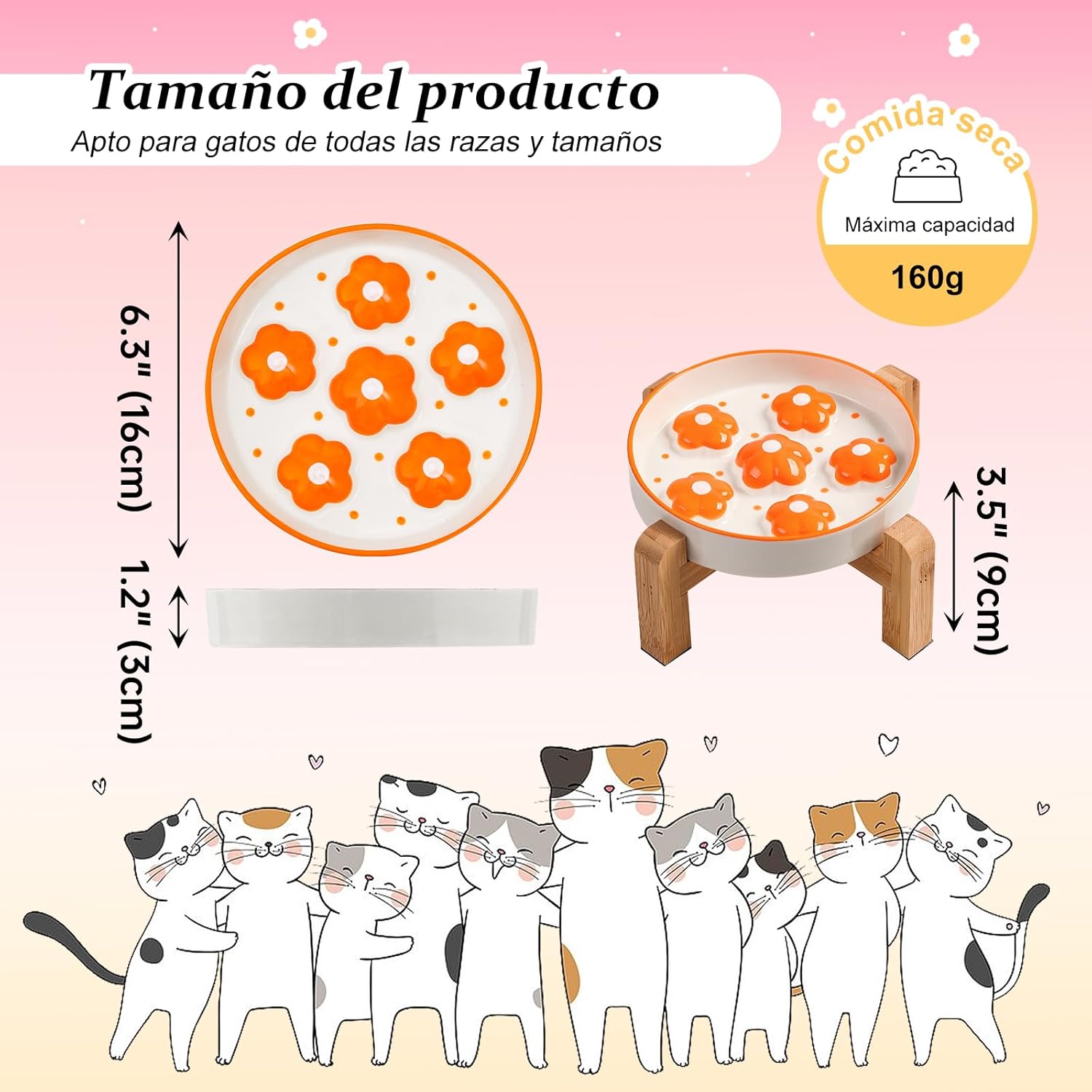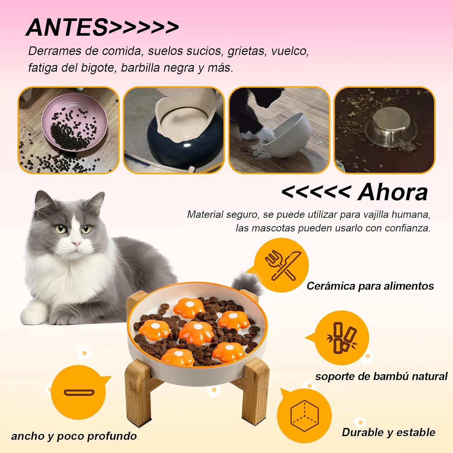 Ideal para todo tipo de alimentos, ya sea comida seca, húmeda o snacks, este comedero es apto para lavavajillas y microondas, facilitando su limpieza. El soporte de bambú se mantiene impecable con solo un paño seco. Dale a tu gato lo mejor con este práctico y elegante comedero para gato antivoracidad elevado.
