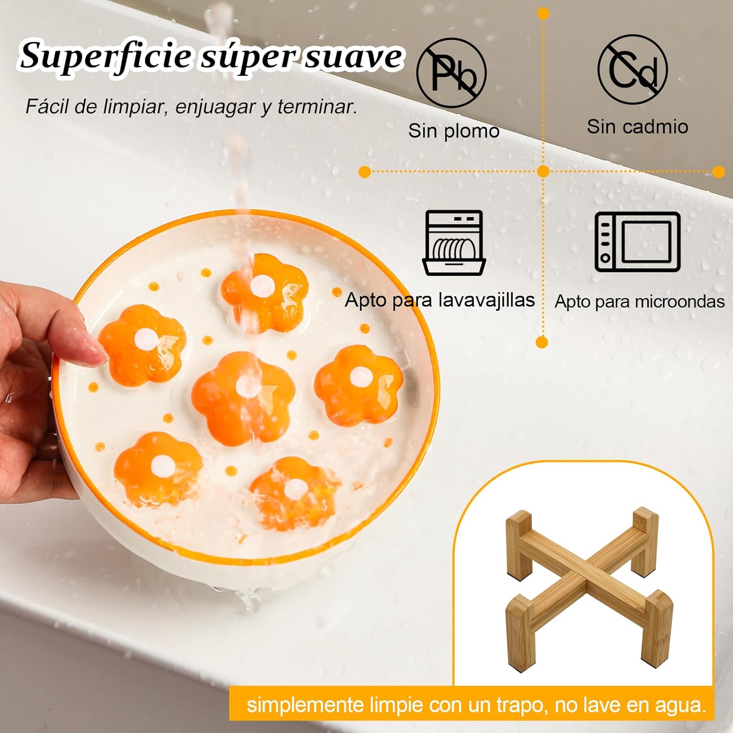 Inspirado en la naturaleza, este cuenco combina funcionalidad y estética con un diseño floral en colores vibrantes que añade un toque de sorpresa y encanto al momento de comer. Fabricado con cerámica de grado alimenticio, libre de plomo y cadmio, y un soporte de bambú natural, el comedero es seguro, duradero y respetuoso con el medio ambiente. Además, incluye pegatinas antideslizantes para garantizar un uso estable y sin vuelcos.