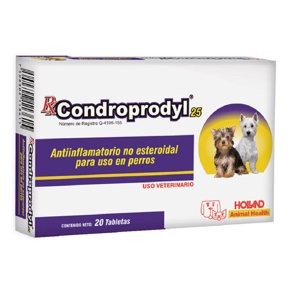 Rx Condroprodyl® 25 mg: 1 tableta por cada 6 kg de peso corporal una vez al día ó tableta cada 12 h.