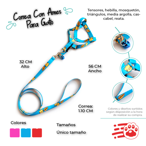 Correa Con Arnés Para Gatos Mayorista – PetOutlet estampado ideal para identificar a tu mascota y sacarla de paseo contiene un cascabel q entretiene a los gatos. Para pasear al gato, lo primero es acostumbrarlo a llevar arnés y correa dentro de casa, entregándole premios mientras los lleva puestos. Cuando el gato ya tolera el arnés, hay que elegir horas y lugares tranquilos para el paseo, teniendo en cuenta que lo mejor es pasearlo en un jardín privado donde hay menos riesgos.