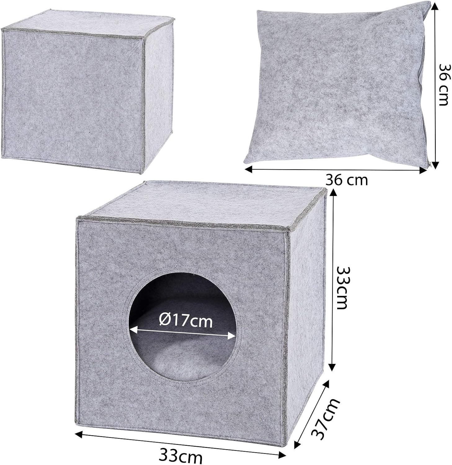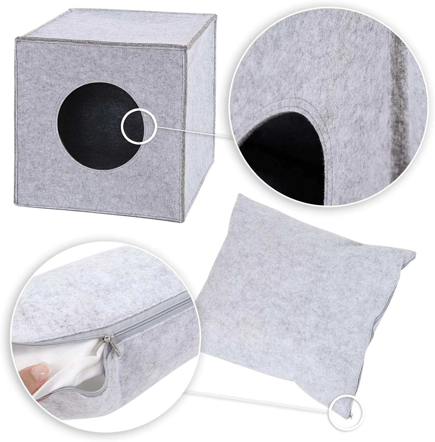 Fabricada con materiales de alta calidad, cuenta con paredes de fieltro cosido de 5 mm de grosor que garantizan estabilidad y durabilidad. Además, es compatible con estanterías como las populares Ikea Kallax/Expedit, gracias a su diseño plegable y su entrada de 17 cm de diámetro. Incluye una almohada suave con funda extraíble para mayor confort, mientras que el fieltro aporta calidez y estilo.