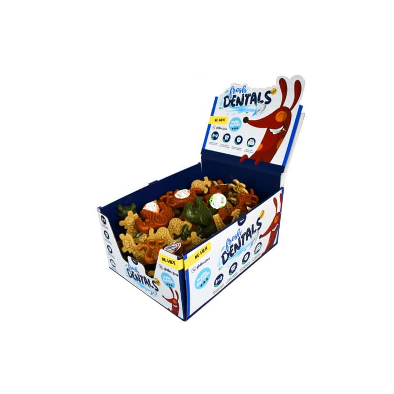 Los Jungle Adventure son unos snacks que tu perro no puede perderse. Combinan verdadero pollo con el delicioso y palatable sabor de las frutas y los vegetales. Los snacks dentales Jungle Adventure de Fresh Dentals están disponibles en diferentes formas de animales de la jungla: elefante, jirafa o leopardo. Las partes en relieve de cada snack ayudan a limpiar las zonas de difícil acceso en la boca, mantenimiento así una buena higiene bucodental. La caja contiene tres sabores: pollo, menta y zanahoria. Peso unidad: 60 g.