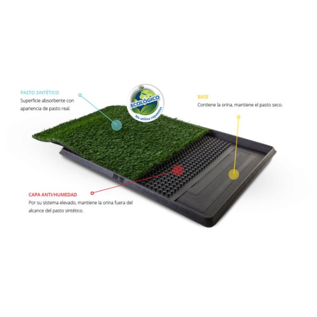 Green Carpet Classic tiene una base ant humedad y sobre esta descansa el pan de pasto sintético. Cuando tu perro va al baño, la orina cae a través del pasto y de los pequeños orificios que contiene dicha capa, permitiendo que llegue hasta la bandeja base. Los pequeños topes que contiene la capa no permite que el pan de pasto sintéetico tenga contanto con la orina, de esta manera se mantiene seco.