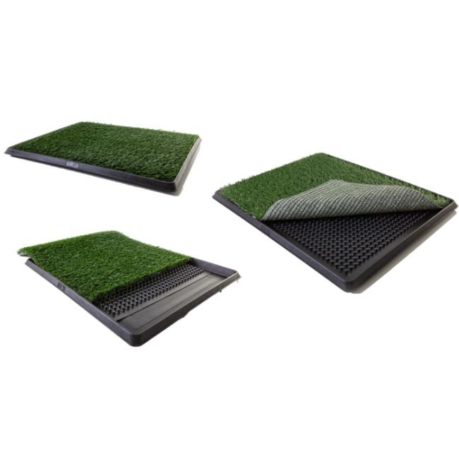 Para esos moments en que no tiene tiempo de llevar a su perro al baño o pasa mucho tiempo fuera de casa, Dog Stuff es la solución para los accidentes de su mascota. Es ideal para el entrenamiento de los cachorros o para perros más grandes que por algunas condiciones no pueden salir al baño. Dogs Stuff está hecho con pasto sintético que le da la apariencia de pasto real resistente al agua, por lo que puede también usarlo en patios, balcones o terrazas. Dog Stuff no es tóxico, además muy facil de limpiar.