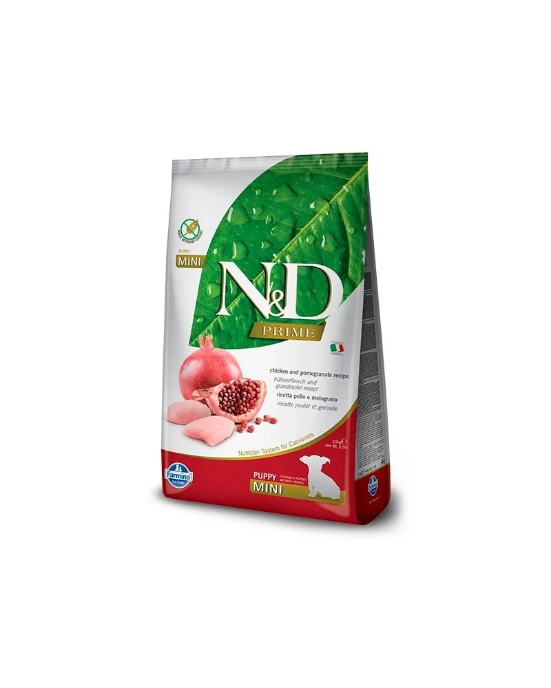 La fórmula Natural&Delicious Prime (ND) de Farmina, elaborada con ingredientes naturales y libre de cereales, está enfocada a cachorros de raza pequeña y perras gestantes o lactantes. Los ingredientes principales son el pollo y la granada. La proteína animal alcanza en esta fórmula un 98% y está cocinada con pollo fresco deshuesado como ingrediente principal (28%). Además de deliciosa, Natural&Delicious Prime contiene un gran número de beneficios nutricionales para tu perro. La granada es considerada un súper alimento por su gran cantidad de beneficios. Sus efectos van desde la reducción de enfermedades cardiovasculares e infecciones bacterianas hasta la mejora de la memoria y el rendimiento físico. La granada es un potente antiinflamatorio que va a ayudar la salud de las articulaciones y huesos evitando que tu perro padezca graves dolencias que le priven de tener una buena calidad de vida.