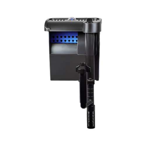 Filtro mochila para acuario. Incluye cartucho, se le puede agregar otro material filtrante. Con indicador de cambio de cartucho. Bomba de 320L/h y 4W.