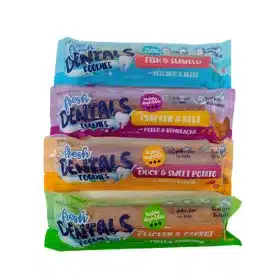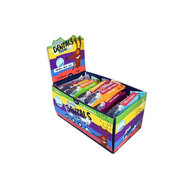 Los Dental Foodies de Fresh Dentals con una original forma de estrella, además de tener un sabor exquisito, ayudan a tu perro a mantener una buena salud bucodental. Su textura esponjosa permite un mayor contacto con la dentadura del perro de forma que tanto encías como dientes queden sanos y fortalecidos. La caja contiene 4 sabores: pato y batata, pollo y zanahoria, pescado y algas y pollo y zanahoria.