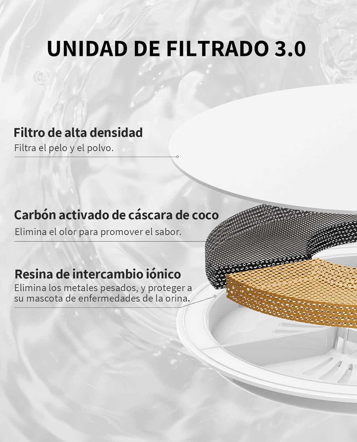 - Hidratación pura con sistema de filtración avanzado: Olvídate de preocuparte por la calidad del agua. Gracias al sistema de filtración 3.0 mejorado, esta fuente utiliza capas de algodón, carbón activado de cáscara de coco y resina de intercambio iónico para eliminar impurezas. El resultado es agua potable rica en oxígeno, ideal para mantener a tu mascota saludable y feliz.