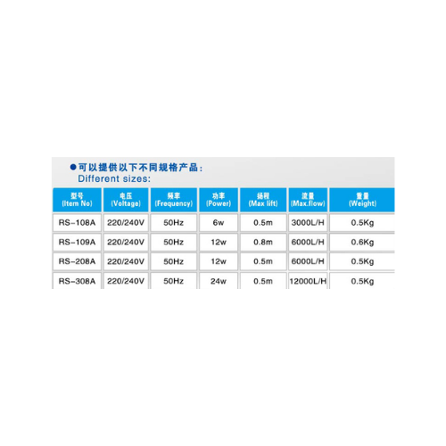 Flujo de 6000L/h. Altura máxima de 0,8m. Potencia de 12w.