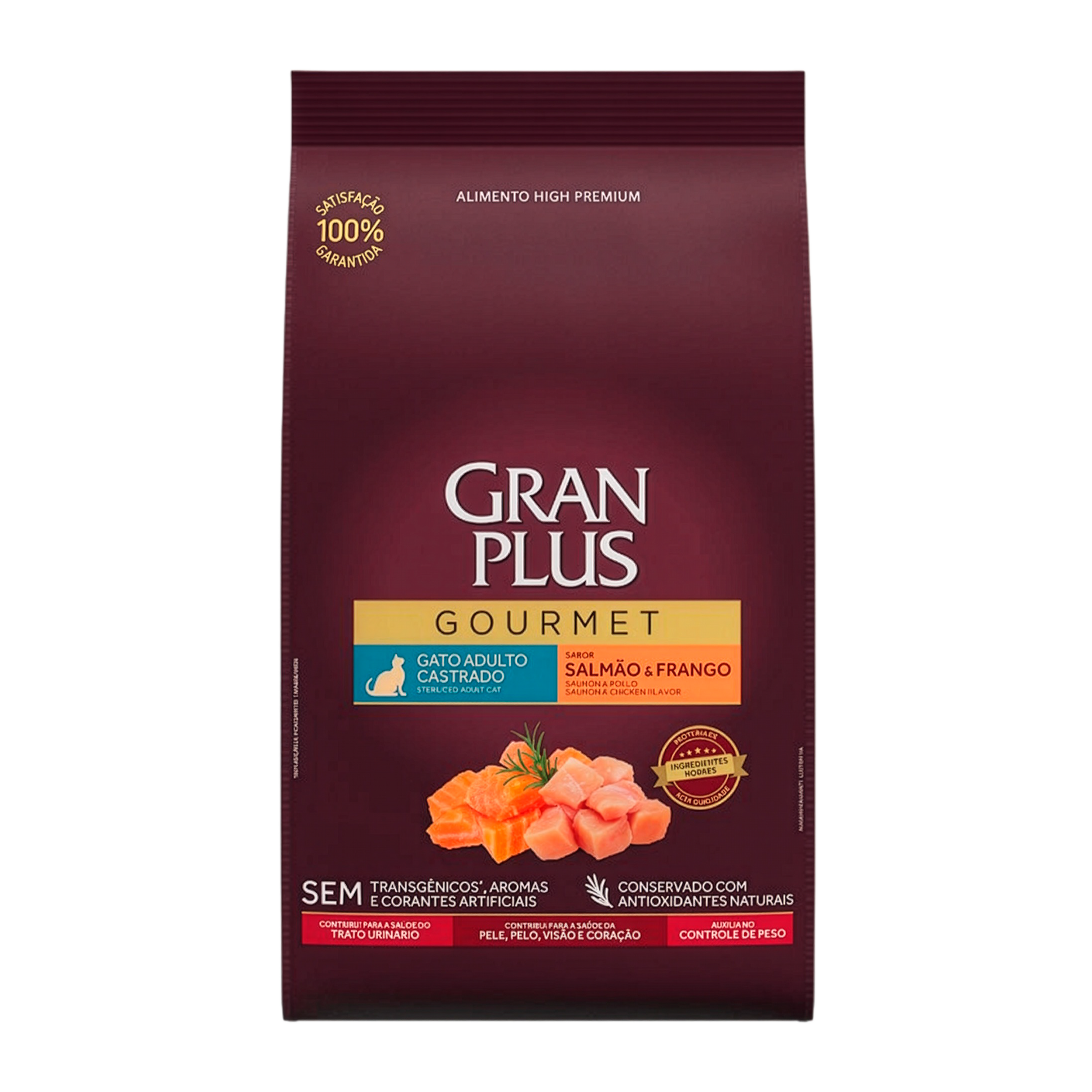 Gran Plus Gourmet Adulto Castrado Salmón y Pollo 10 kg ofrece una combinación perfecta de ingredientes para el bienestar de tu gato: