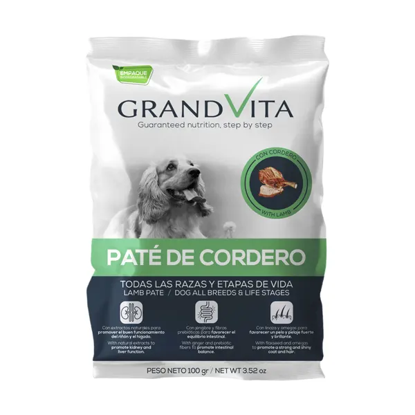 El Paté de Cordero Grand Vita es un alimento húmedo diseñado para perros de todos los tamaños y etapas de vida. Su fórmula con proteína de alta calidad ayuda a mantener el sistema musculoesquelético fuerte, mientras que los ácidos grasos Omega contribuyen a una piel sana y un pelaje brillante. Con extractos naturales para promover el buen funcionamiento del riñón y el hígado. Con jengibre y fibras prebióticas para favorecer el equilibrio intestinal. Además, su delicioso sabor lo convierte en una excelente opción para complementar la dieta diaria de tu mascota.