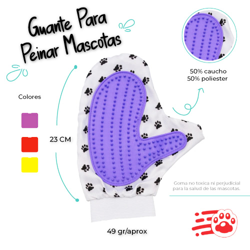 Guante para peinar mascotas, fácil de usar, No lastima la piel de las mascotas. El pelo se adhiere al guante, por lo que es fácil de quitar y botar el pelo después del aseo de las mascotas. Mejora la calidad de higiene. Su diseño en forma de guante le permite llegar a todas las zonas del cuerpo del animal sin problemas.