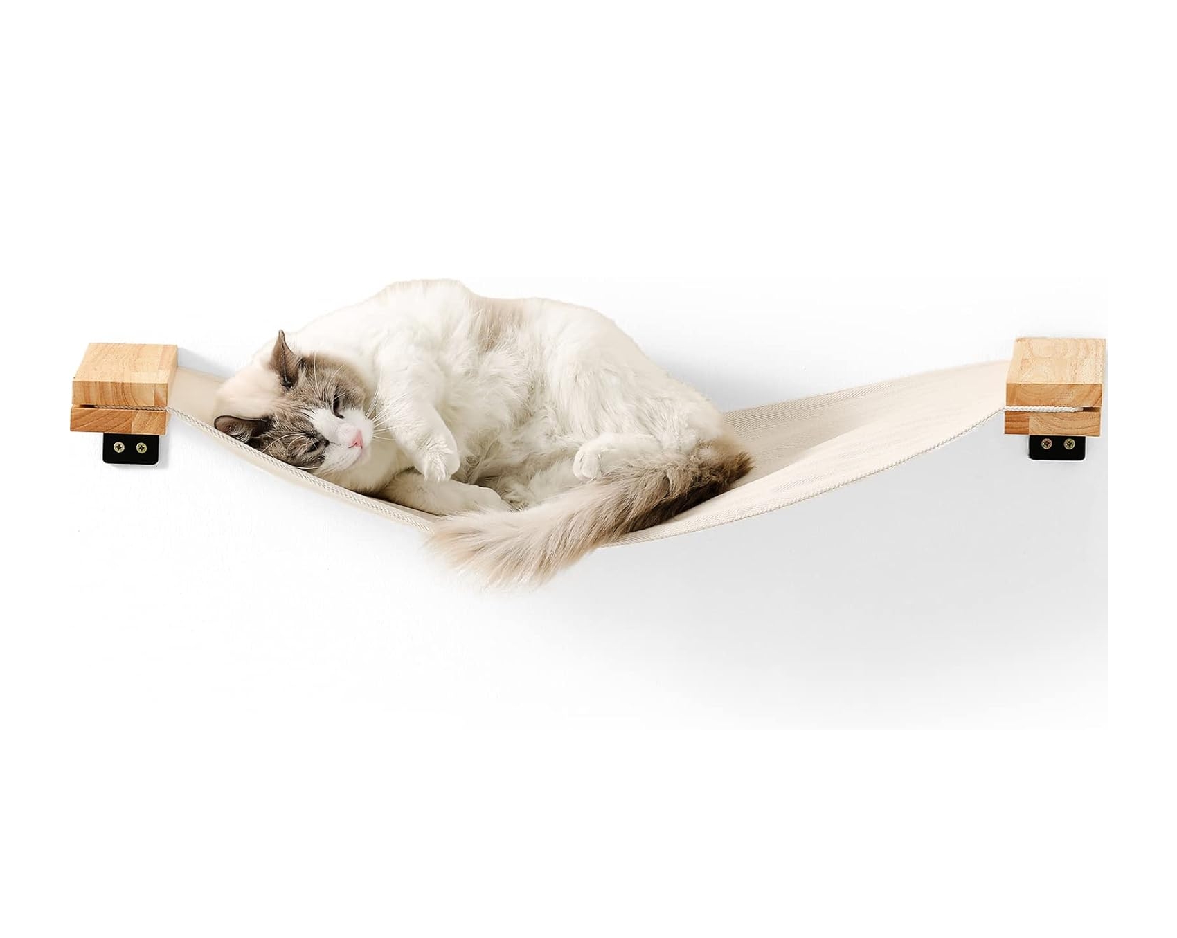 - Mueble moderno y práctico para gatos. Más que una hamaca, es un elegante parque infantil que se instala directamente en la pared. Ofrece un espacio vertical donde tu gato puede explorar, observar o descansar, mientras tú aprovechas mejor el espacio disponible en casa.