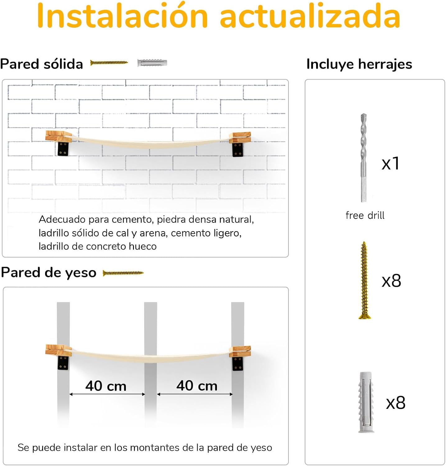 - Instalación rápida y sencilla. Incluye herramientas e instrucciones fáciles de seguir. En menos de 30 minutos, tu gato podrá disfrutar de su nueva área de juego y descanso vertical.