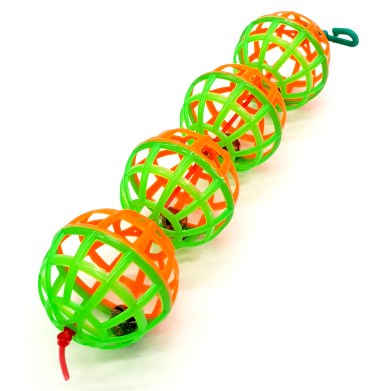 Juguete fabricado en plástico y de colores llamativos, costa de 4 bolas con cascabel en su interior cada una de ellas.