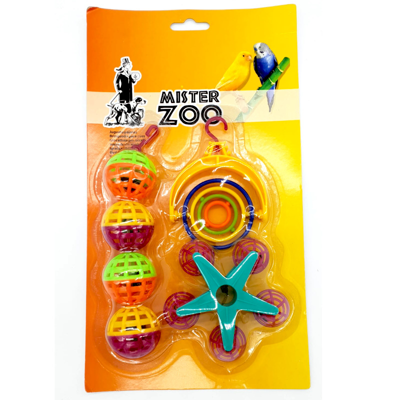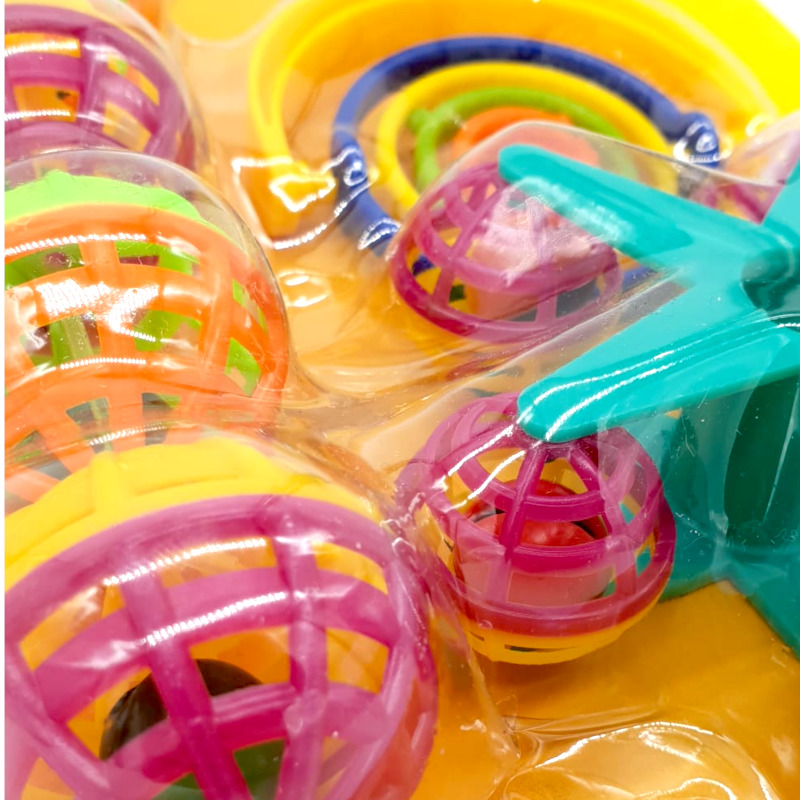Costa de tres piezas, un juego de bolas giratoria con cascabeles dentro, un juego de aros de color llamativo y un juego de campanas con cestas para colocar en el techo de su jaula