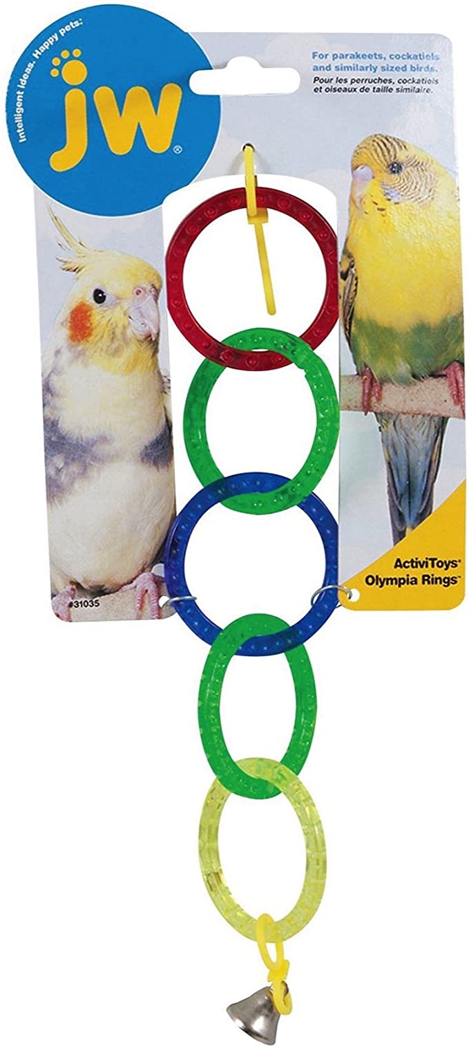 El JUGUETE AVES ACTIVITOYS OLYMPIA RINGS para aves con cuatro aros olímpicos de colores y agarrador para la jaula, el cual también incluye una pequeña campana al final para atraer al ave.