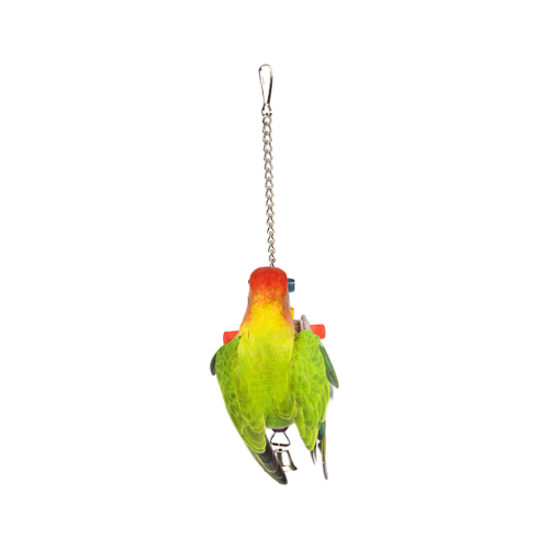 Juguete colgante para loros, fabricado en madera. Medidas: 8cm x 31cm.