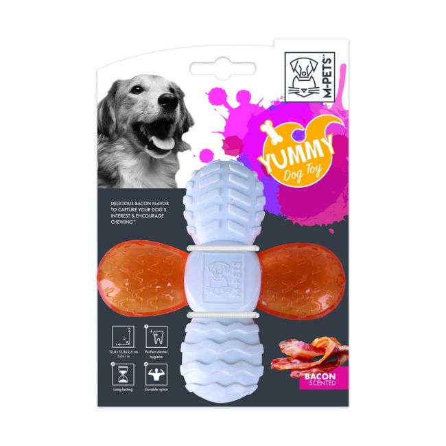 YUMMY CROSS BACON es un divertido juguete masticable, fuerte, hecho de nylon y 100% seguro con un sabor delicioso a tocino que a tu perro le encantará. El diseño único que posee este producto masajea las encías de los perros y limpia sus dientes de una manera lúdica. Son hechos completamente duraderos para los masticadores potentes.