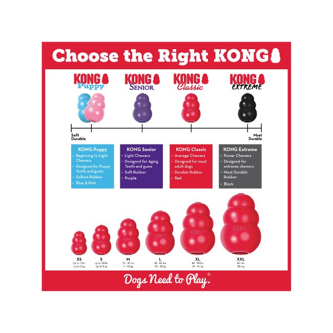 El KONG Classic es el modelo de referencia de los juguetes para perros y ha sido el artículo esencial de los perros de todo el mundo desde hace más de cuarenta años. Los beneficios del KONG Classic ayudan a satisfacer las necesidades instintivas de los perros, y su exclusiva fórmula de caucho rojo completamente natural es ultraduradera y produce un rebote errático ideal para perros a los que les gusta masticar mientras satisfacen su necesidad de jugar. ¿Quiere prolongar el tiempo de juego? Rellénelo con tentadores trozos de alimento balanceado y colóquele un toque de mantequilla de maní para que sea aún más atractivo.